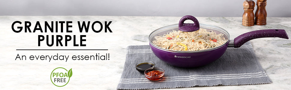 A. Wonderchef Granite Wok is a designer forged pan made with pure grade virgin aluminium for quick and even heat distribution. It is ideal for everyday cooking and the wok is designed for all your Chinese cooking and ideal for stir-frying, steaming, pan frying, deep frying, etc. The perfect solution to cooking healthy, low fat and delicious meals at home. It is strong and long lasting with 3.5mm thickness. The long handle is ergonomic and gives a comfortable secure grip. Ergonomically designed soft touch handles that do not heat up during cooking. It is 100% PFOA free, heavy metal and nickel free for your safety and has a health-friendly 5 layer Meta Tuff non-stick coating for daily use.