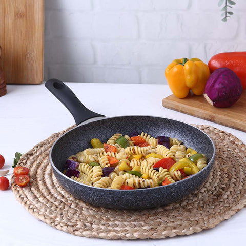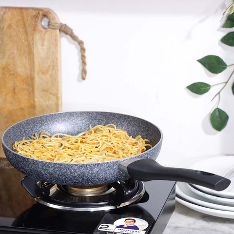 Wonderchef Graphite Fry Pan works like a charm! The beautiful stone finish and ravishing deep grey shade will surely add beauty to your kitchen. One of the most versatile cookware in your kitchen, this fry pan can be used to prepare delicious cutlets, omelets, pasta, stir fry veggies and more. Its premium healthy non-stick coating enables oil – free cooking without any compromise on taste! Get stellar performance every time you cook with Graphite fry pan from Wonderchef.