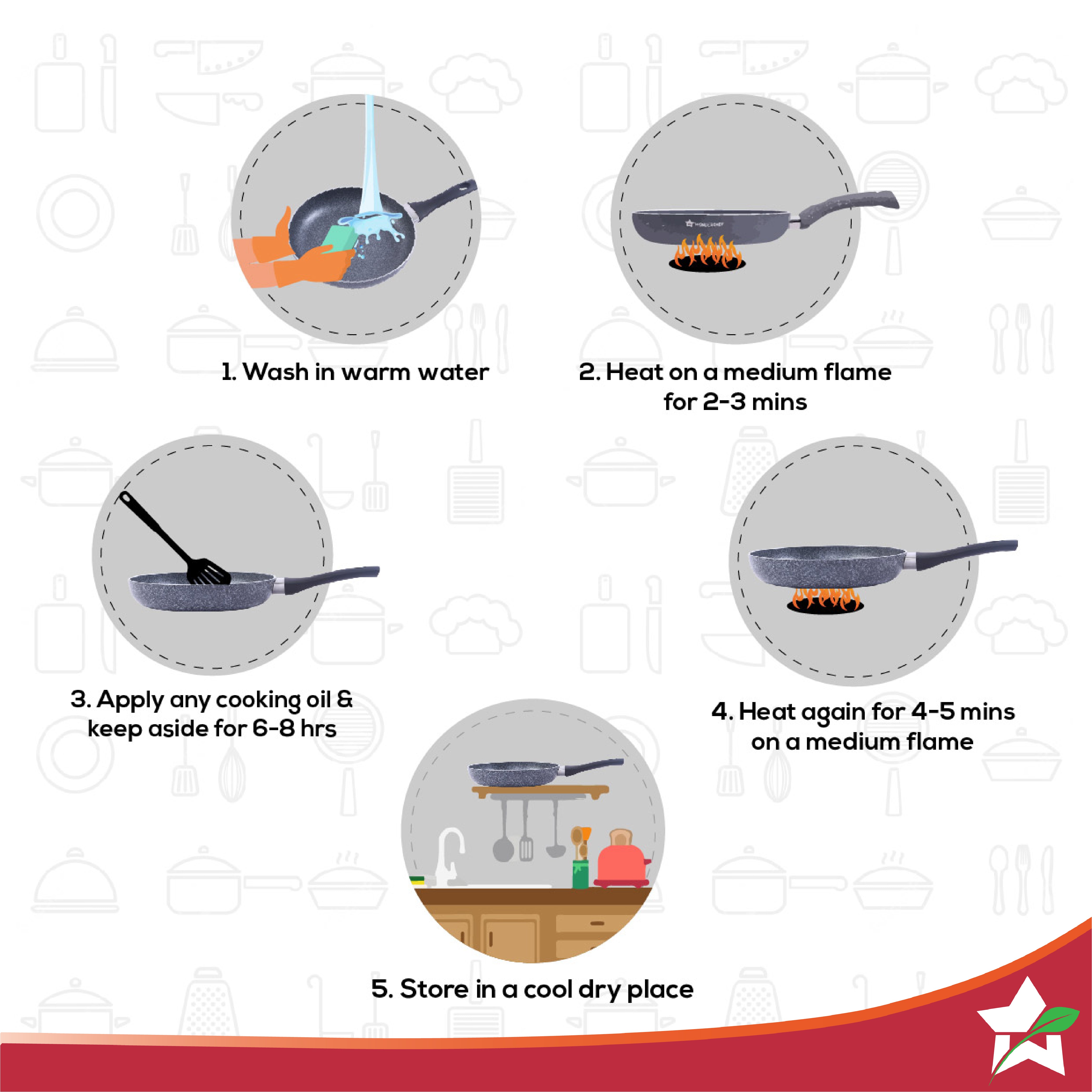 To clean, hand wash the cookware in warm, soapy water, and then rinse and thoroughly hand dry. Safety Instructions