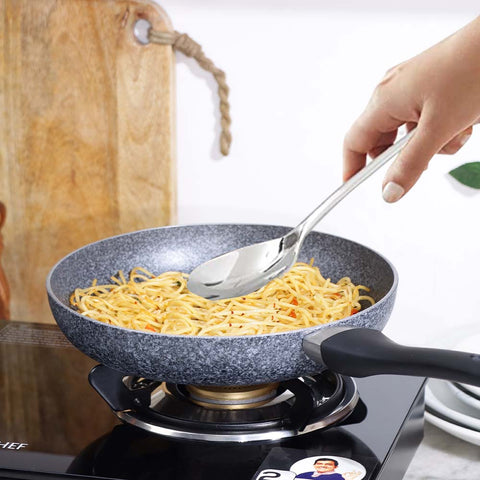 Enjoy the pleasant cooking experience with the all new Graphite non-stick cookware range. Featuring a beautiful stone finish with German non-stick coating from Greblon; the fry pan, grill pan, wok, dosa tawa and casserole will add beauty to your kitchen. Graphite range is made from pure grade virgin aluminium which is 9 times beer conductor of heat than steel. Now you can freely use a metal spoon without the fear of scratches on the coating. The so-touch handles provide a comfortable grip. Time to cook healthy, stay fit and get stellar performance everytime you cook with Graphite range of non-stick cookware by Wonderchef.
