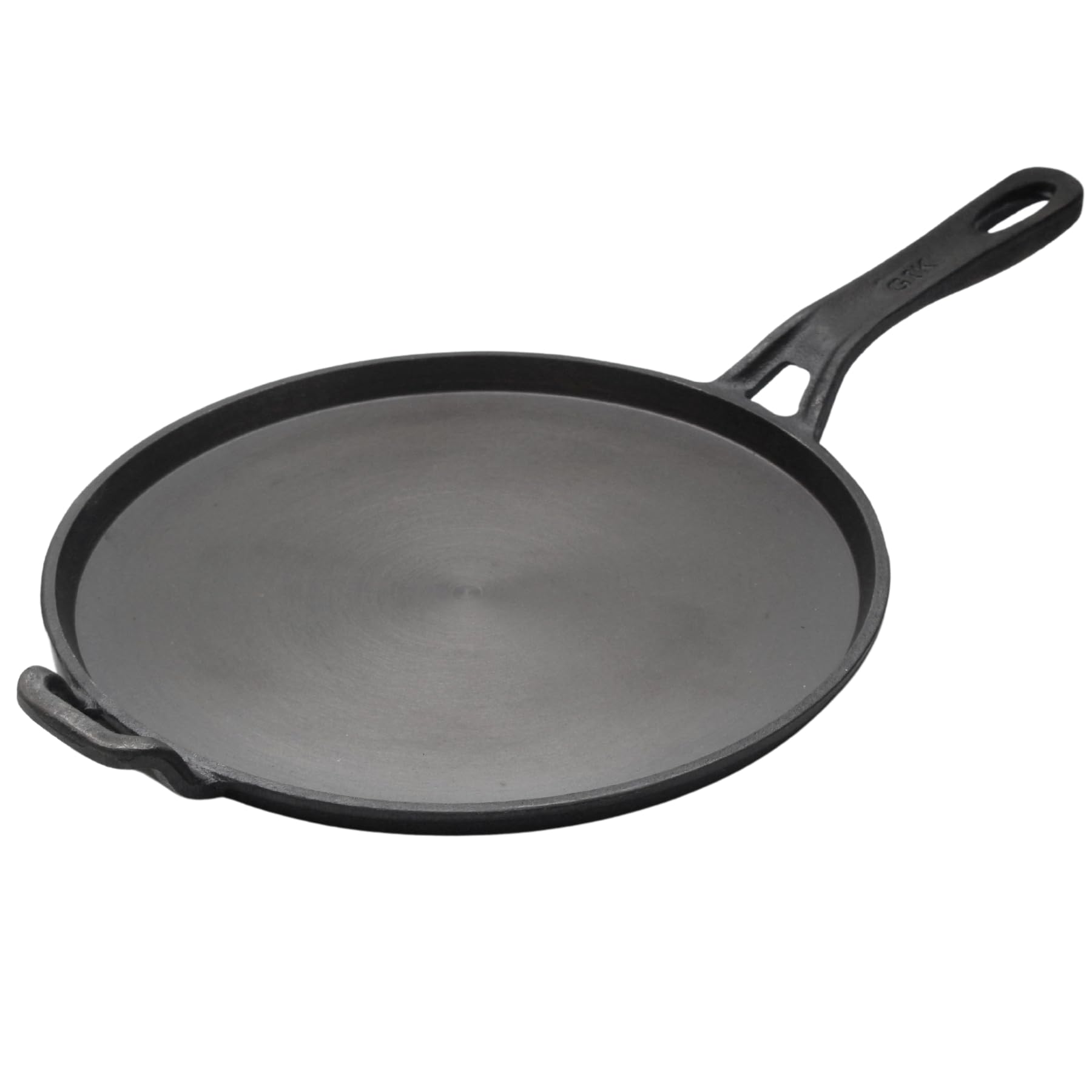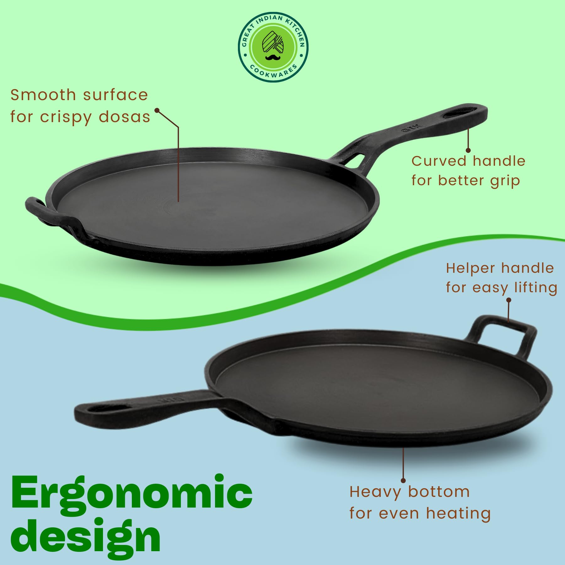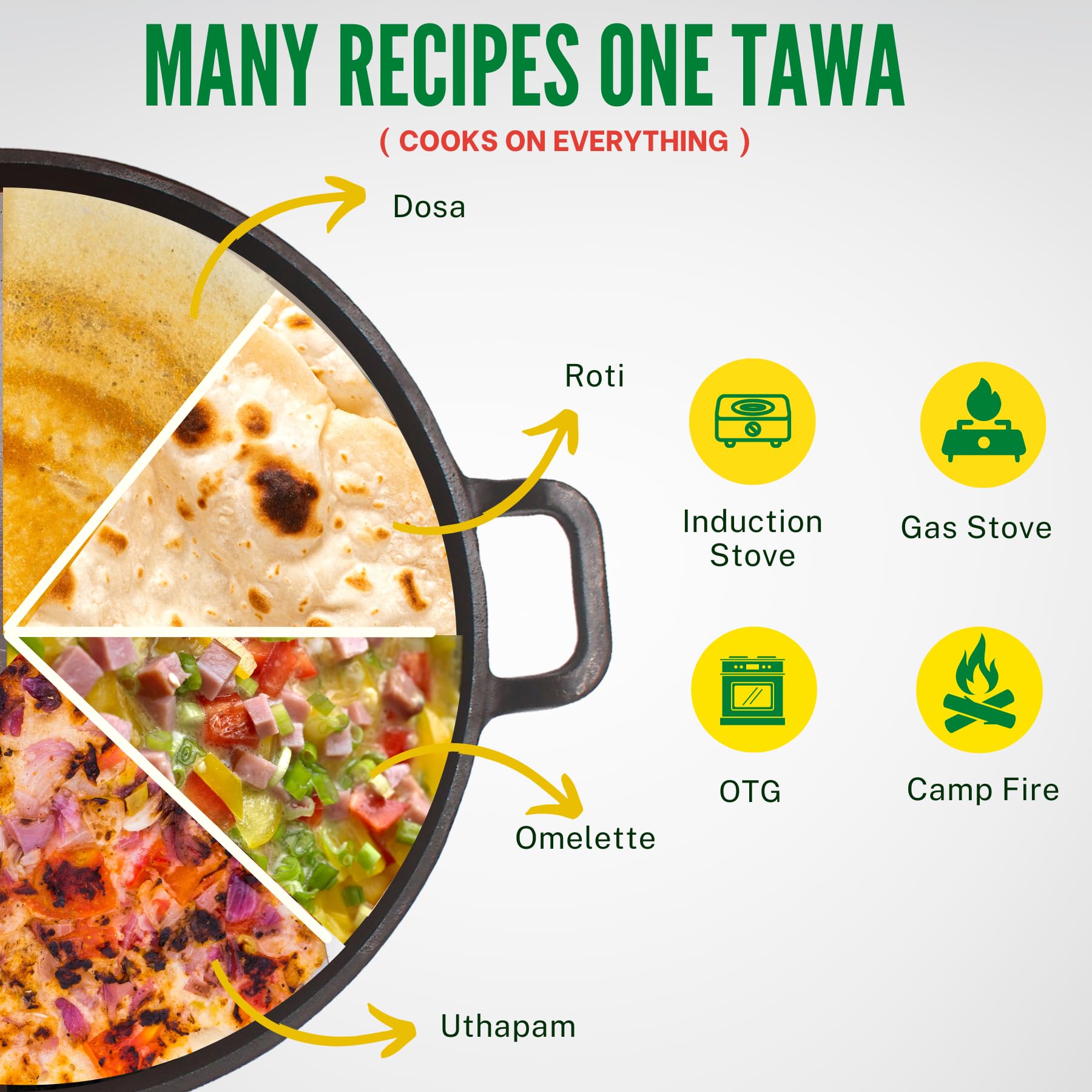 - 🍳 COOKS ON EVERYTHING – Suitable for all cooktops including Induction, Gas, Electric, Ceramic, Halogen, Radiant, and Solid Plates etc. All our cast iron tawa for dosa comes with a double handle for easy handling.