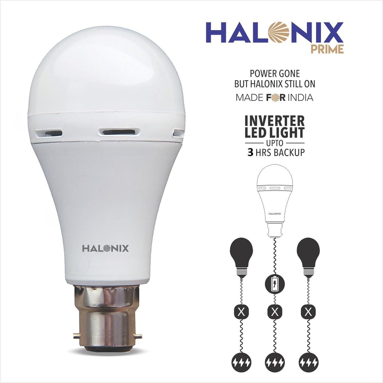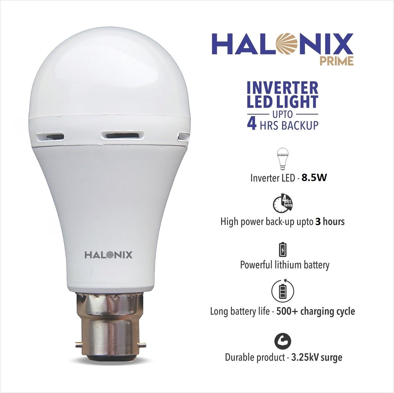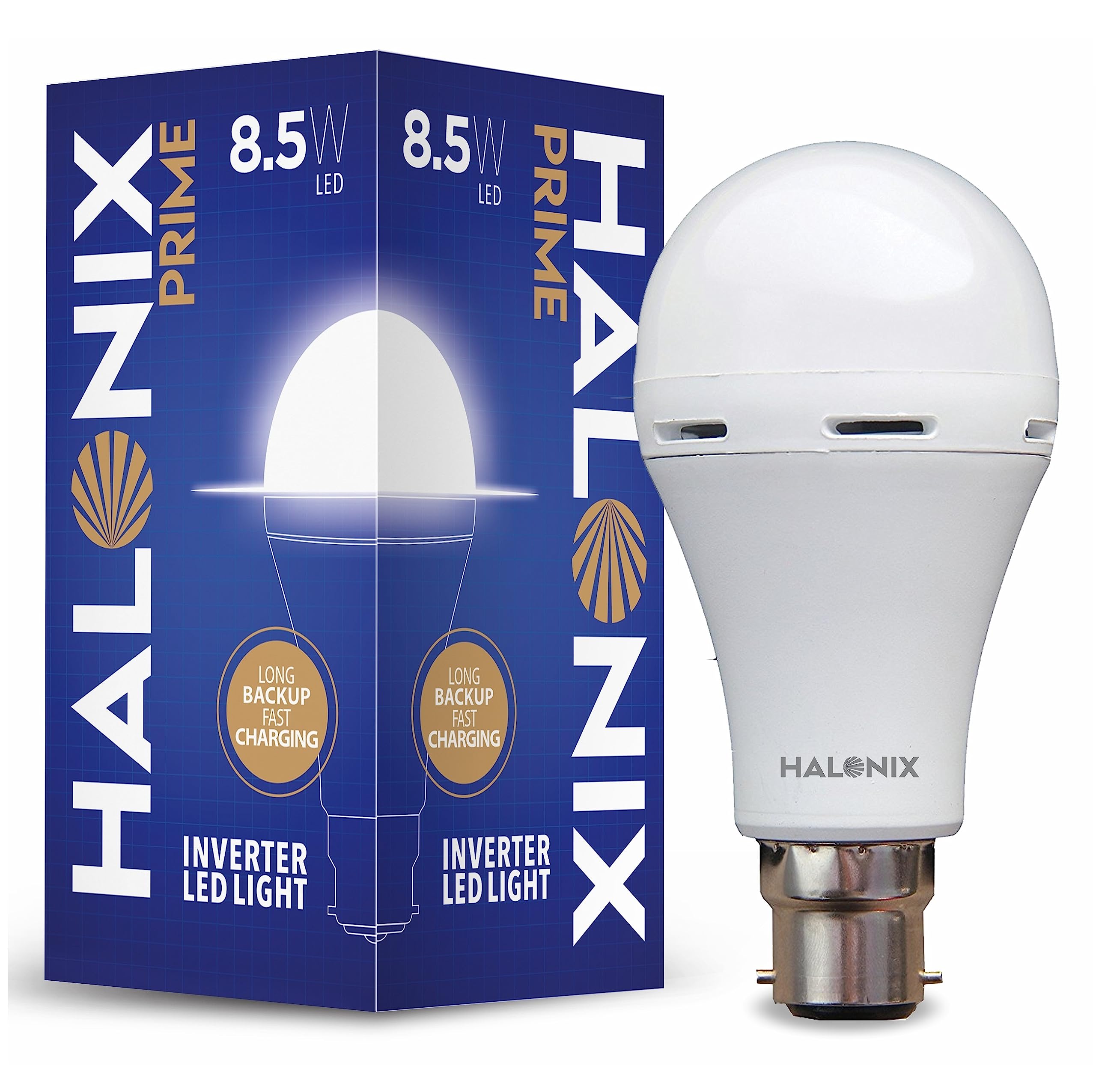 - Bulb Base-B22, Colour Temperature- 6500K, Lumens-850lm.Halonix 8.5W Inverter rechargeable emergency Led bulb will get automatically charged when it is kept on.