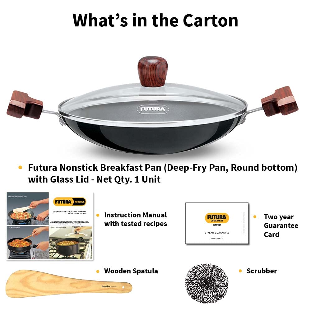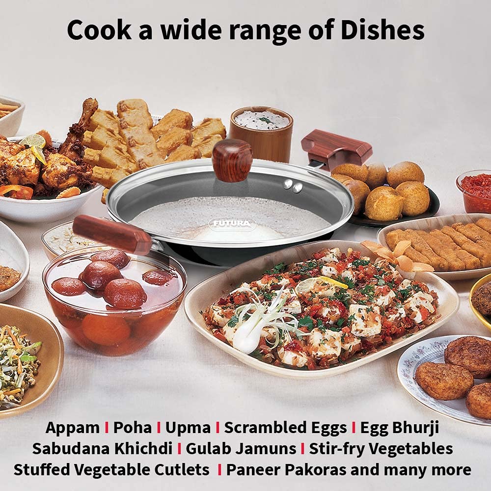 Details: Futura Nonstick Breakfast Pans are distinguished by elegant, comfortable rosewood handles fixed on sturdy stainless steel brackets which are permanently riveted to the pans. The handles are carefully designed to provide greater comfort and safety, particularly when handling hot foods. The cooking surface is made of PFOA-free with a unique patented process by which high quality nonstick coating (made in Germany) is locked firmly into the tough Hard Anodised surface underneath. Therefore, the nonstick, if used properly, would last longer than the ordinary nonstick. The pans have curved sides suitable for deep-frying and stir-frying. The pans are offered with a Round Bottom for greater convenience during stir-frying and ideal for use on domestic gas stoves or radiant electric cooktops. The Lid is made of AISI 304, 18/8 food grade Stainless Steel that is extremely hygienic, durable and non-reactive to most foods. It has a comfortable, stay-cool Rosewood knob. The toughened, thick Glass Lid is made of heat-resistant glass with a strong stainless steel rim and stay-cool knob. It stops splatter of hot foods.