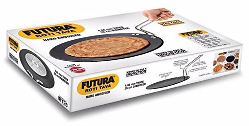 Details: The futura hard anodised roti tava has all the features of the futura hard anodised tava (griddle). The body/base of the tava is 4.88 Mm thick. Permanently attached to the base is a plate of aisi 430 grade magnetic stainless steel which makes the tava induction compatible. Suitable for use on all domestic gas, electric, halogen, ceramic and induction cooktops.