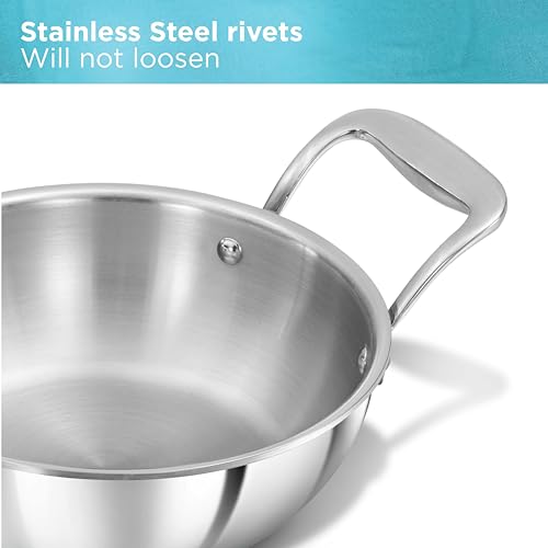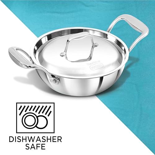 Details: Hawkins Pro Triply Stainless Steel Deep-Fry Pan (Kadhai) is engineered for culinary excellence, achieving professional results every time. Featuring a robust tri-ply stainless steel construction, this pan ensures that food cooks evenly without sticking or burning, even with minimal oil, guaranteeing optimal cooking performance. Designed for your comfort and safety, the stay-cool handles allow for easy and secure handling, even when the pan is hot. Whether you’re using gas, induction, or the oven, this deep-fry pan adapts effortlessly to various cooking methods, offering versatility and convenience in the kitchen. The stainless steel rivets ensure that the pan remains sturdy and stable, preventing any concerns about loosening or durability. The pan is dishwasher safe, making maintenance a breeze and freeing up more time for culinary creativity. Complete with an elegant, food-grade, extra-thick lid equipped with a stay-cool handle, this deep-fry pan combines functionality with style.