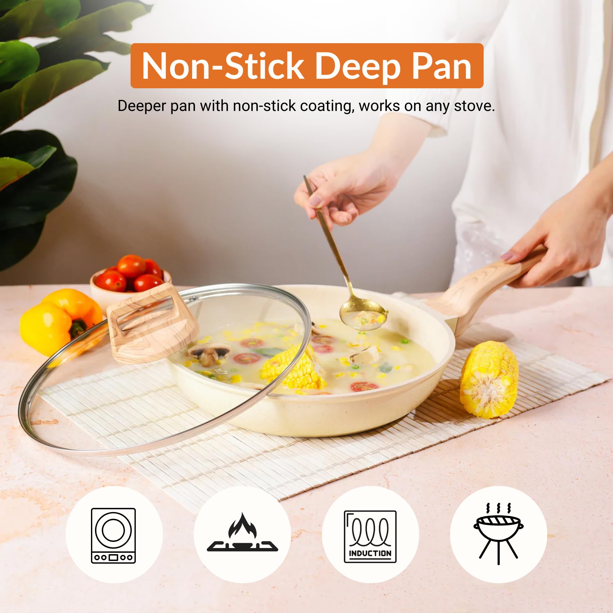 - Nonstick Surface: The pan boasts a nonstick surface that effectively prevents food from sticking, reducing the need for excessive cooking oil. This feature promotes healthier cooking by allowing the use of minimal edible vegetable oil.