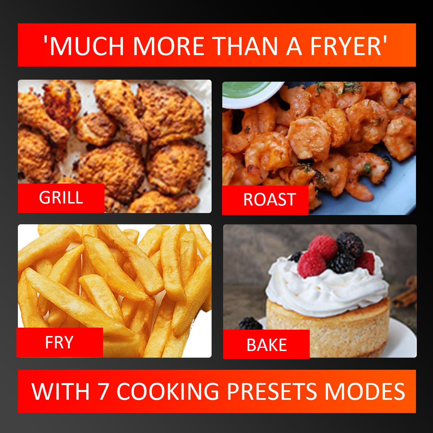 iBELL 5Litre Air Fryer is a Healthy, Guilt-free way to Enjoy your Favourite Fried Foods. It has Rapid Air Technology lets you Fry, Grill, Bake & Roast. Touch Control and Digital Display, 7 Preset Modes, Automatic Shut off, Adjustable Temperature Control, Large Capacity, Oil Free Cooking, Easy to Use, Fast and Uniform Heating.