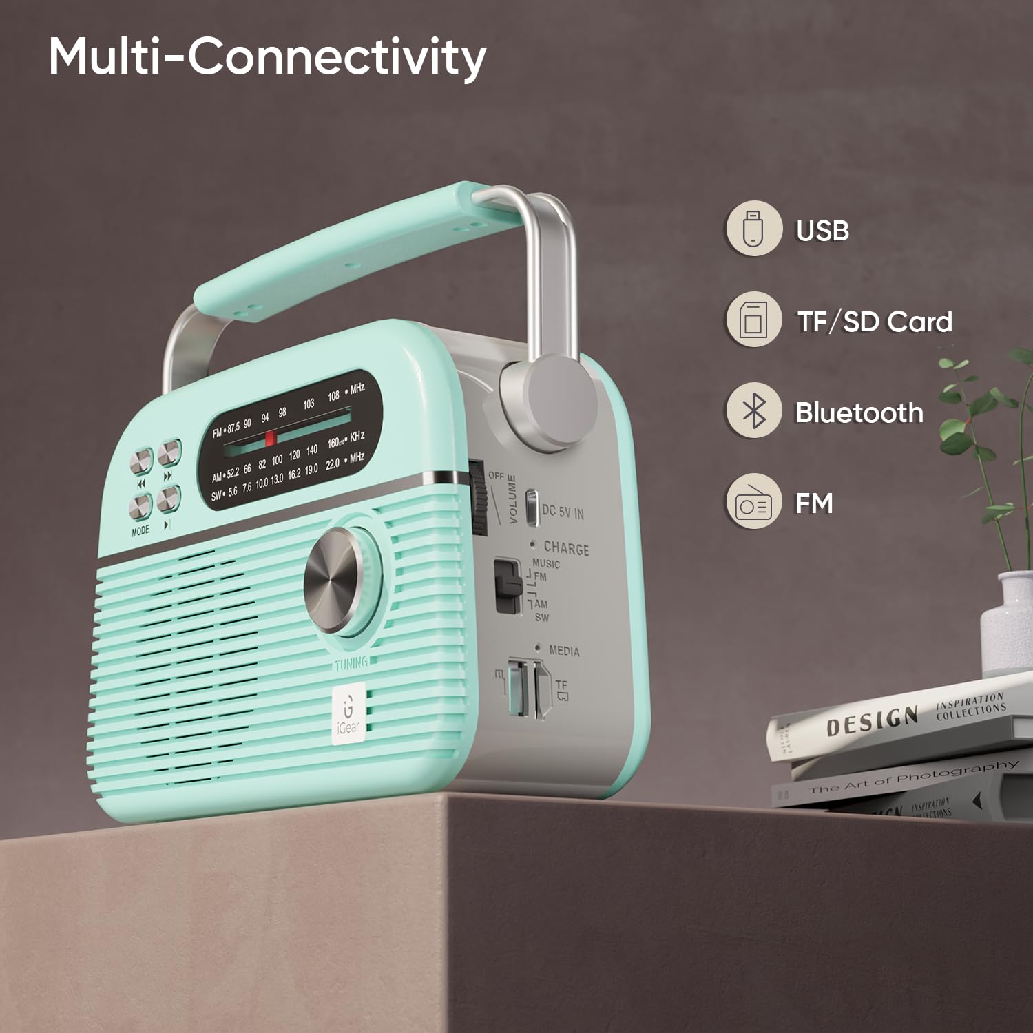 Details: Introducing the iGear Trinity Retro Radio, a fusion of vintage charm and modern functionality. Immerse yourself in nostalgia with its classic design while enjoying cutting-edge features. With Bluetooth connectivity, stream your favorite tunes effortlessly. Tune in to your favorite stations with the 3-band radio for endless entertainment. Multi-connectivity options let you connect to various devices for a seamless experience. Plus, embrace eco-friendly living with solar charging capability, ensuring uninterrupted music playback. Elevate your audio experience with the iGear Trinity Retro Radio – where timeless design meets contemporary innovation