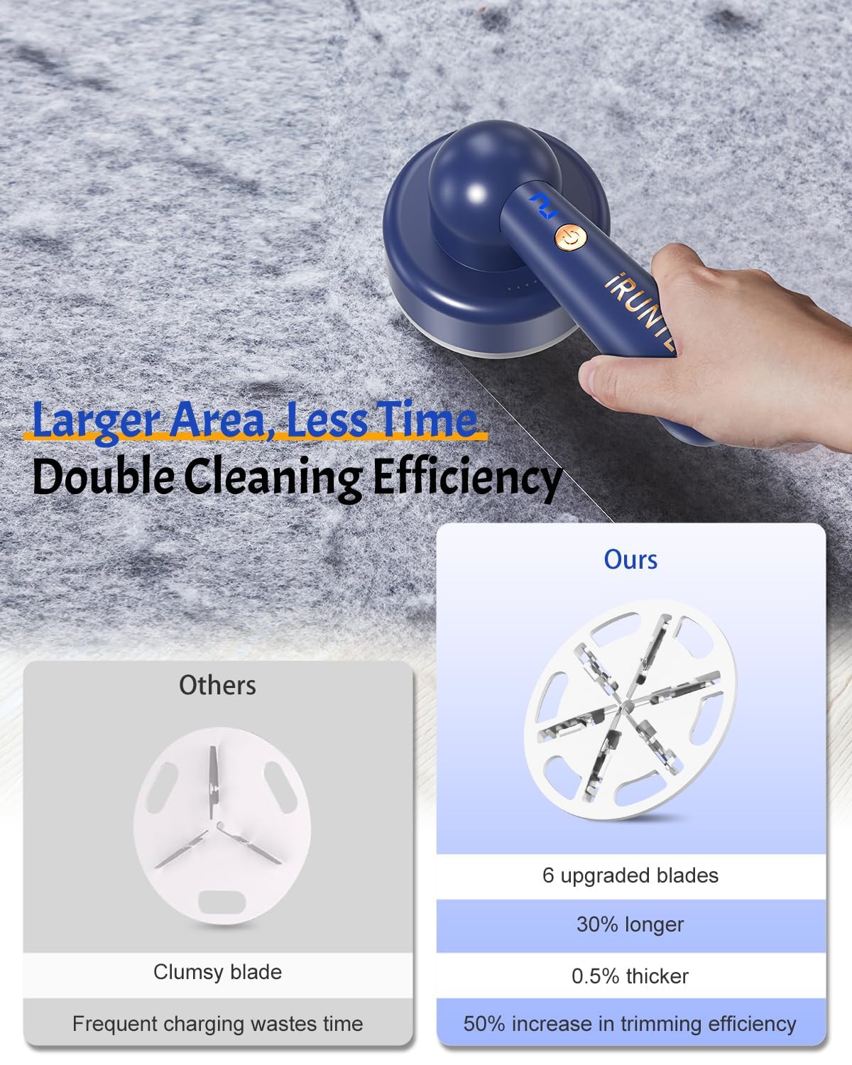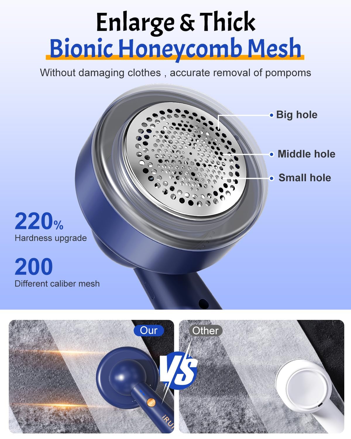 - 🧶𝗗𝗼𝘂𝗯𝗹𝗲 𝗖𝗹𝗲𝗮𝗻𝗶𝗻𝗴 𝗘𝗳𝗳𝗶𝗰𝗶𝗲𝗻𝗰𝘆: Lint shaver features an upgraded stainless steel 6-leaf blade and 85000RPM high-speed motor, resulting in double the cleaning efficiency compared to other 3-leaf blade shavers. The stainless steel mesh cover has 3 different size hole diameters to accommodate different sizes of lint balls, ensuring quick and residue-free cleaning.