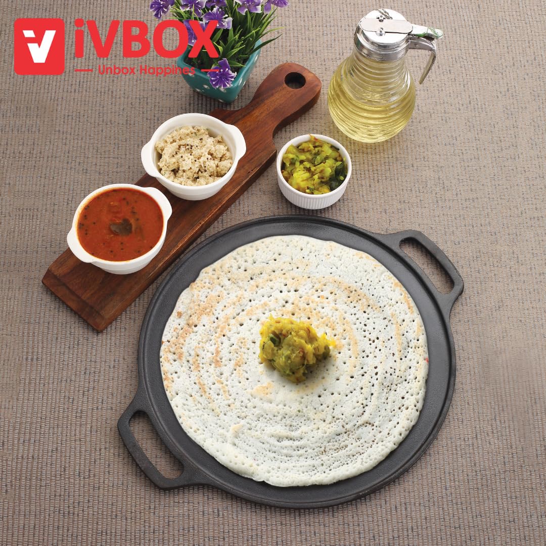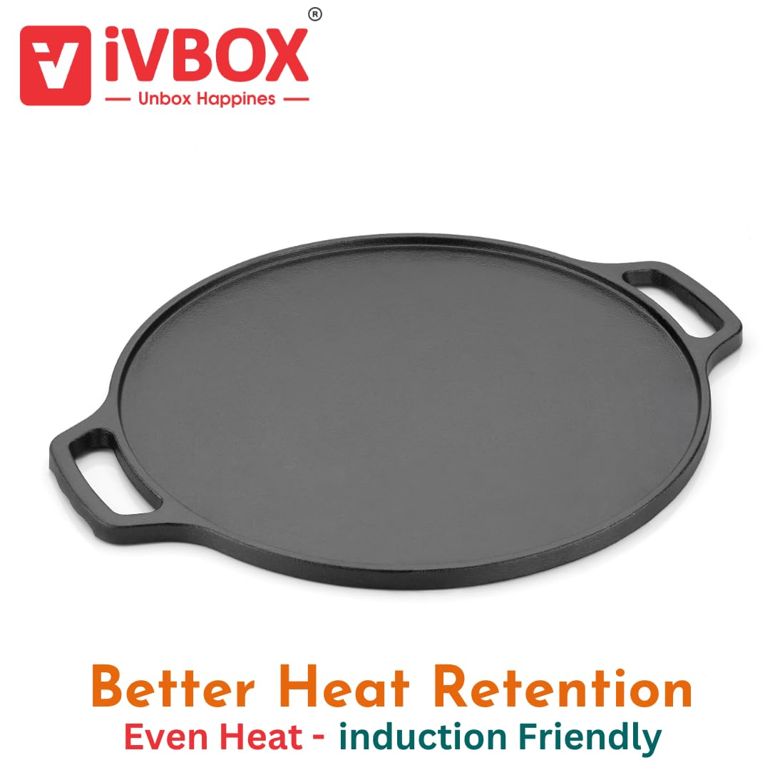Details: iVBOX Vintage-DH 30cm Cast Iron Flat Tawa/Tava for Dosa/Roti/Chapati/Naan, Pre-Seasoned Cast Iron Cookware(Gas and Induction Compatible), 300mm, Black Here are the benefits of cast iron cookware : Excellent Heat Retention: Cast iron retains heat remarkably well, ensuring consistent and even cooking. Natural Non-Stick Surface: When seasoned properly, cast iron develops a natural non-stick coating, reducing the need for excessive cooking oils. Durability: Cast iron is highly robust and can withstand high temperatures and prolonged use without warping or deteriorating. Versatility: Cast iron cookware can be used on various heat sources, from stovetops to ovens, grills, and even campfires. Enhanced Flavors: The seasoning of cast iron adds depth and richness to the flavors of cooked dishes. Long Lifespan: With proper care, cast iron cookware can last for generations, making it a cost-effective and sustainable choice. Health Benefits: Cooking with cast iron can increase the iron content in your food, providing potential health benefits for those with iron-deficient diets. Chemical-Free Cooking: Cast iron is free from potentially harmful chemicals often found in non-stick coatings. Versatile Cooking Styles: Cast iron accommodates a wide range of cooking techniques, from frying and searing to baking and simmering. Retains Moisture: Cast iron’s heavy lid and excellent heat retention help keep dishes moist and prevent them from drying out during cooking. Aesthetic Appeal: The rustic appearance of cast iron adds charm and character to your kitchen and dining presentation. Value for Money: Despite a higher initial cost, the long-lasting quality of cast iron makes it a worthwhile investment over time. Even Heat Distribution: Cast iron ensures consistent heat distribution, eliminating hot spots and promoting uniform cooking.
