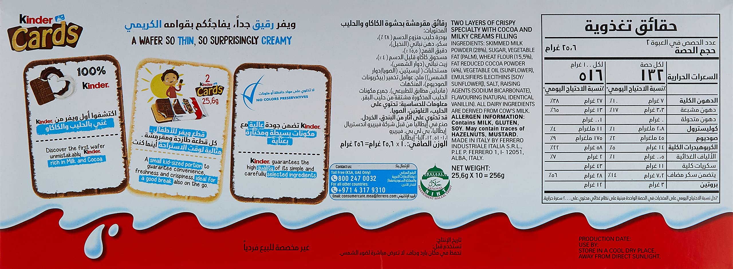 Details: A BISCUIT SO THIN AND YET SO TASTY! As soon as you bite into Kinder Cards, you discover the creamy filling inside: two crispy wafers, one made with milk and the other with cocoa; so thin that on biting, you immediately discover the creamy milk & cocoa filling with the unique taste of Kinder, without feeling heavy. Kinder Cards is rich in milk and prepared with quality ingredients, without preservatives and colourings. Invented for kids, but ideal for the whole family, portion-controlled, convenient also for on-the-go.