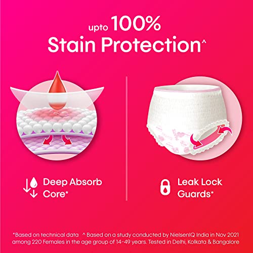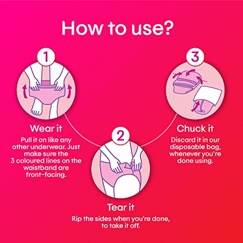 Details: 9/10 girls agree that it is a life changing product^ and ensures 100% stain protection^. You can enjoy the absorption of a pad with the fit of a panty for a 360 degree anti-leakage protection*. It soaks wetness for upto 12 hours*, making it the perfect choice of heavy flow period times. Wear it on like an underwear, Rip the sides when you are done and discard it in our disposable bag! *Based on technical data ^Based on a study conducted by NielsenIQ India in Nov 2021 among 220 Females in the age group of 14-49 years. Tested in Delhi, Kolkata & Bangalore