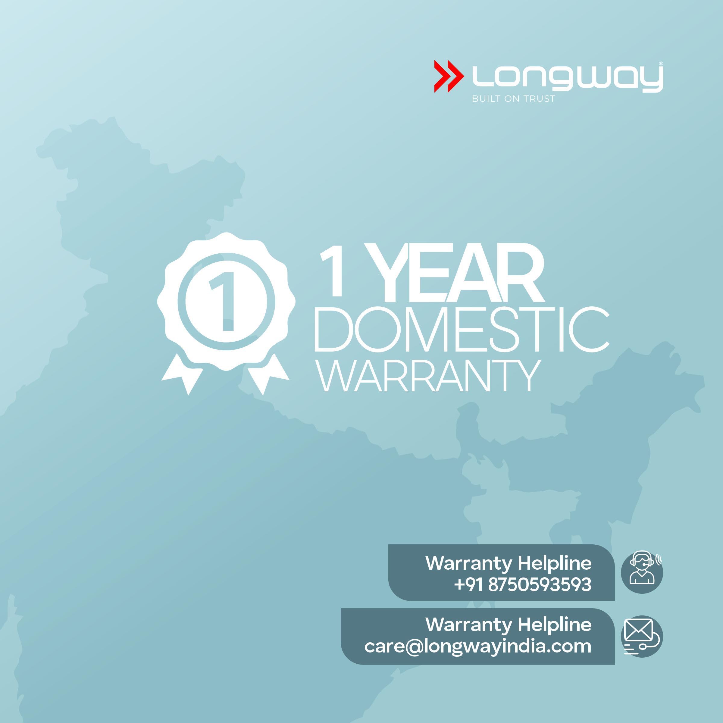 - Warranty Period : 1 Years Limited Domestic Brand Warranty. Enjoy the hassle free warranty by Longway on your product.