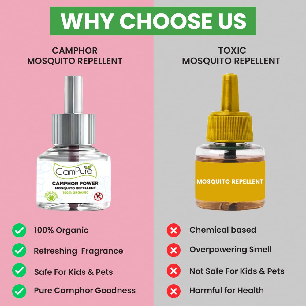 - HEALTHY REPELLENT WITH CAMPHOR: CamPure Power does not have any harmful/cancer causing chemicals such as TFT, DEET, Kerosene and is therefore non toxic with no side effects. The fragrance of camphor has a calming effect on the mind and brings a good night’s sleep