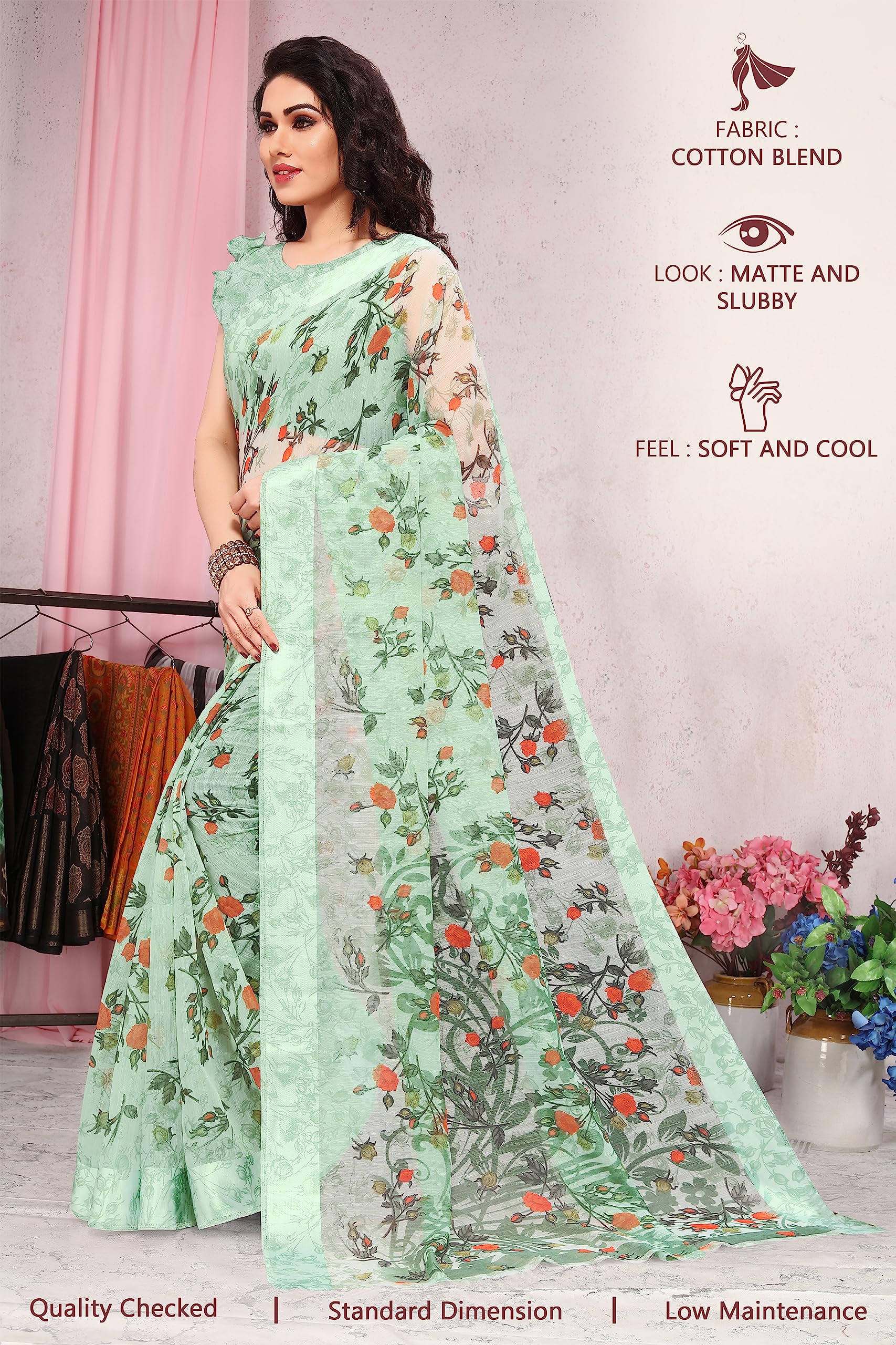 Beautifully designed Indian Traditional ethnic regular wear sarees made of high-quality fabric Cotton Blend having beautiful tropical flower prints with stylish mix pattern palav, shiny woven border and printed blouse. SOURBH Fashion brings you a nice addition to the wardrobe of every fashionable female, who wants to look glamorous and distinct.