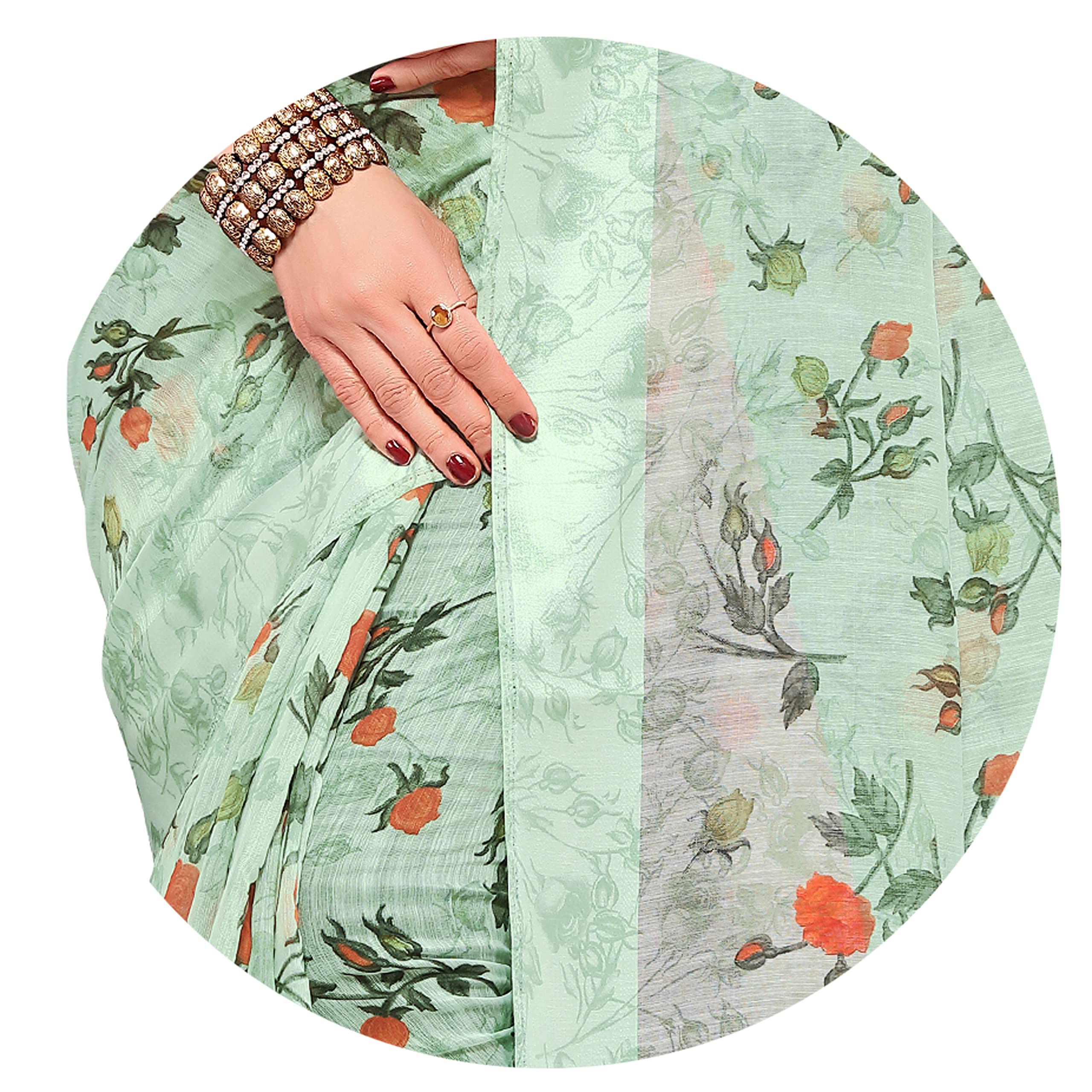 This sari comes with matching Cotton Blend printed blouse fabric, which can be stitched according to your comfort Up to 32 to 42 Inches.