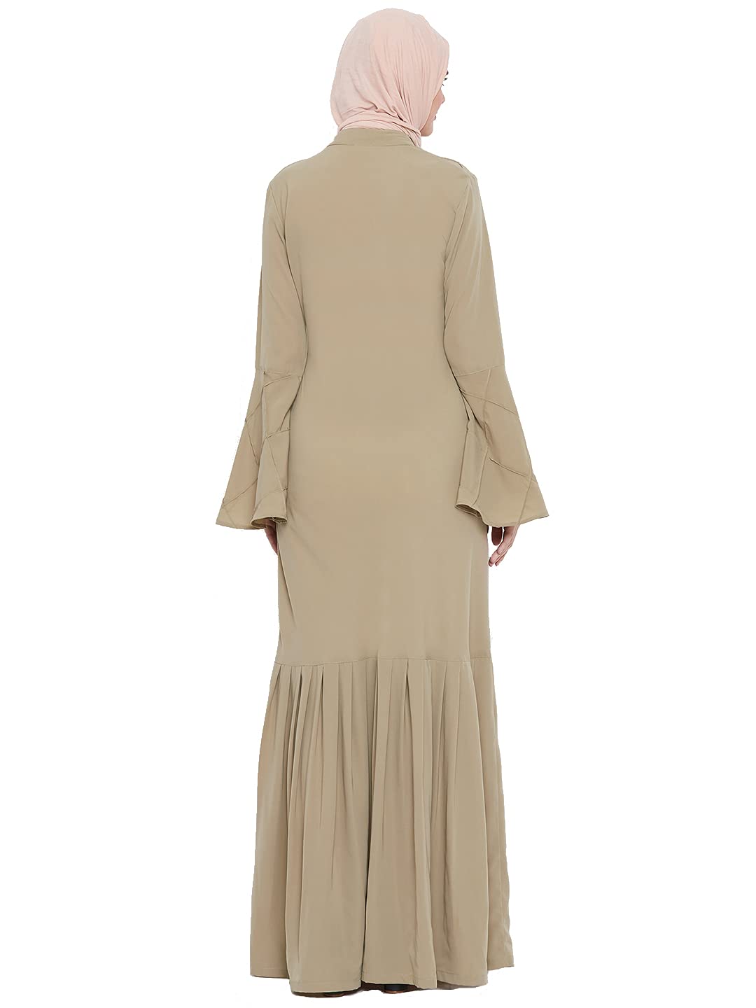 Women’s preety pleat work Bell sleeves & front pleat work round neck beige abaya. Soft polyester fabric. No colour Bleeding. No shrinkage after wash. Normal hand/ machine wash.
