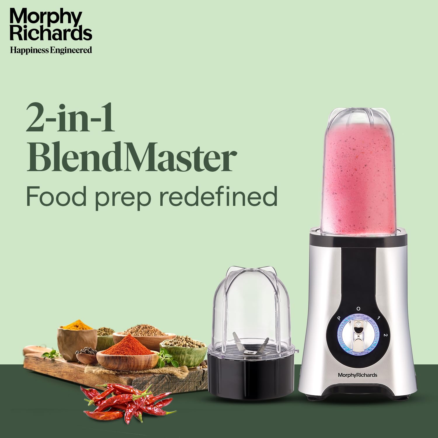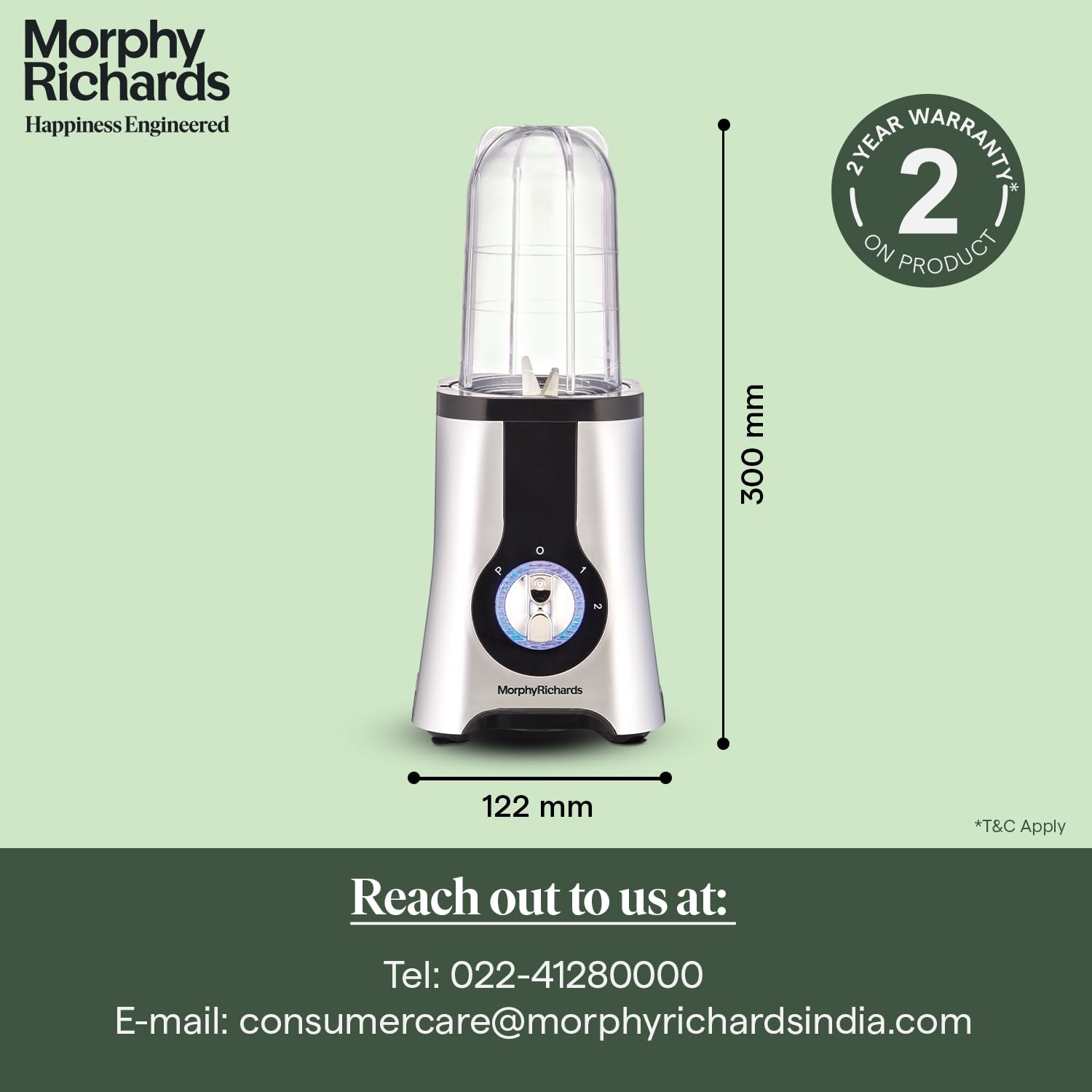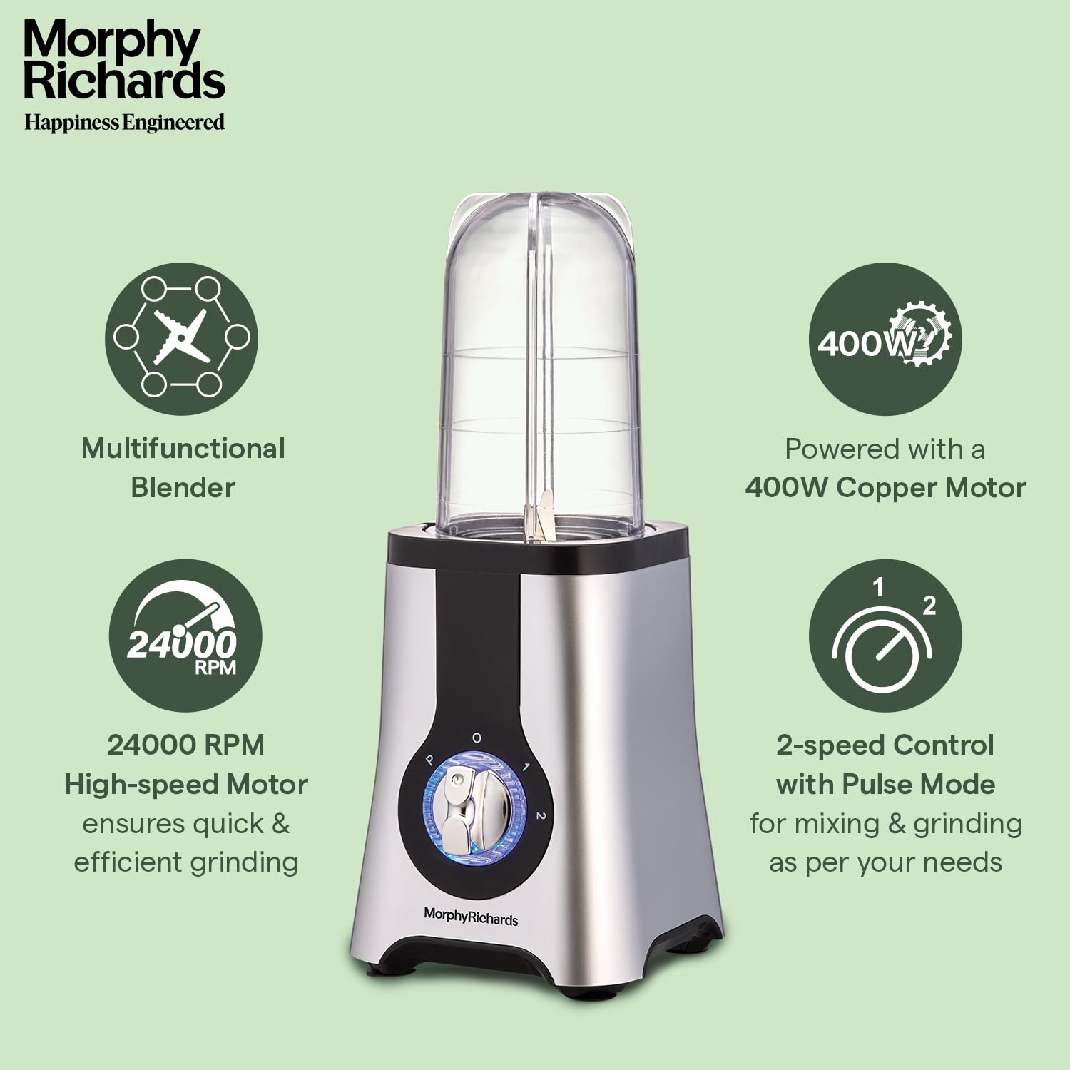 1. 400W Powerful motor 2. Multifunctional blender – Multipurpose compact blender that can grind, mix, blend & crush 3. 24000 RPM – High speed motor for quick & unmatched grinding performance 4. 2 Speed control with pulse mode – Mix & grind a variety of food items as per your need 5. Attachments – Jars 300ml & 500ml, 2 leaf blade for grinding & 4 leaf blade for blending