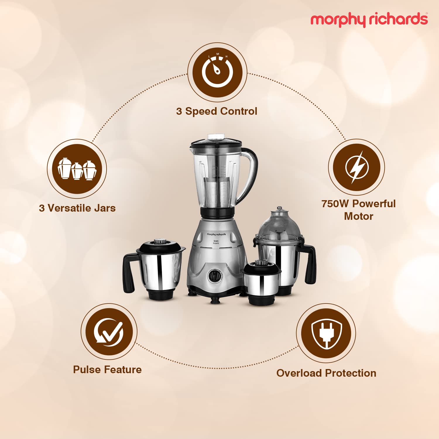 - Multiple Jars: 4 jars, including a 1.7L Juicer Jar, 1.5L Liquidising Jar, 1L Dry/Wet Grinding Jar, and 0.4L Chutney Jar