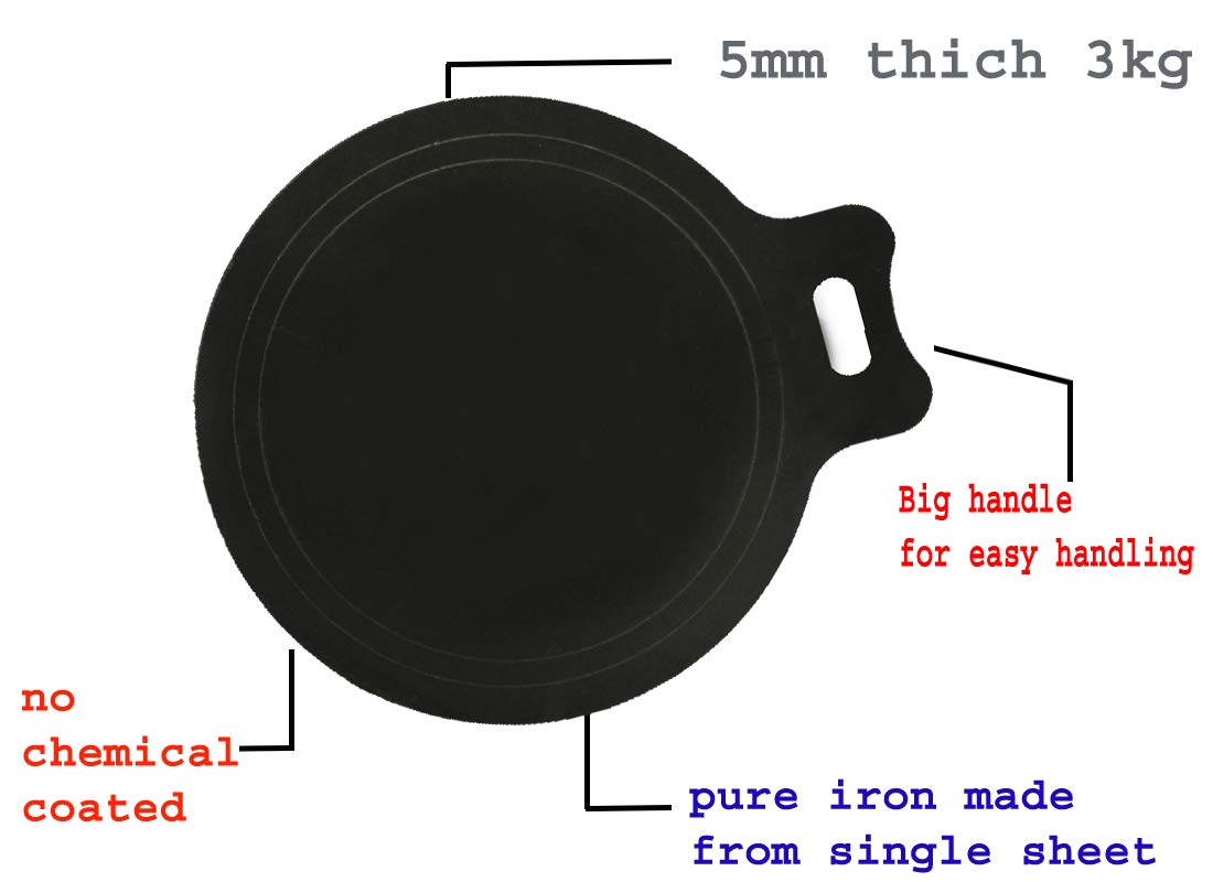 - ☑Nakshathra Iron Dosa Kallu Tawa: curved edge Weight: 3.KG,Diameter:35.5cm×30cm with handle,Thickness: 5 MM (For people who love big Dosa and large families) Completely hand-made, pre- treated tawas without any chemical coating & works as good as non-stick. ☑Traditional cookware made by rural artisans of Tamil Nadu, Known for making these products for generations tawa retains heat for long duration and helps in saving energy when making lots of crispy. ☑Cooking food