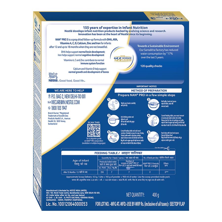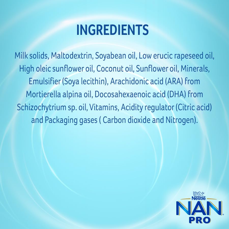 Details: Nestlé NAN PRO 3 is a spray dried follow-up formula with DHA, ARA, Vitamins A, C, D, Calcium, Zinc and Iron for infants after 12 months and up to 18 months when they are not breastfed. Nestlé NAN PRO 3 contains DHA. DHA helps support normal brain development. Also contains Iron. Iron helps support normal cognitive development. Contains Vitamins A, C and Zinc. Vitamins A, C and Zinc contribute to normal immune system function. Contains Calcium and Vitamin D. Calcium and Vitamin D help support normal growth and development of bones. 155 years of expertise in Infant Nutrition Nestlé develops infant nutrition products backed by evolving science and research. Innovation has been at the heart of Nestlé since its beginning. Nestlè agrees with the World Health Organization and other medical and health associations that breast milk is the best and the most natural food for babies. Important Notice: Mother’s milk is best for your baby.