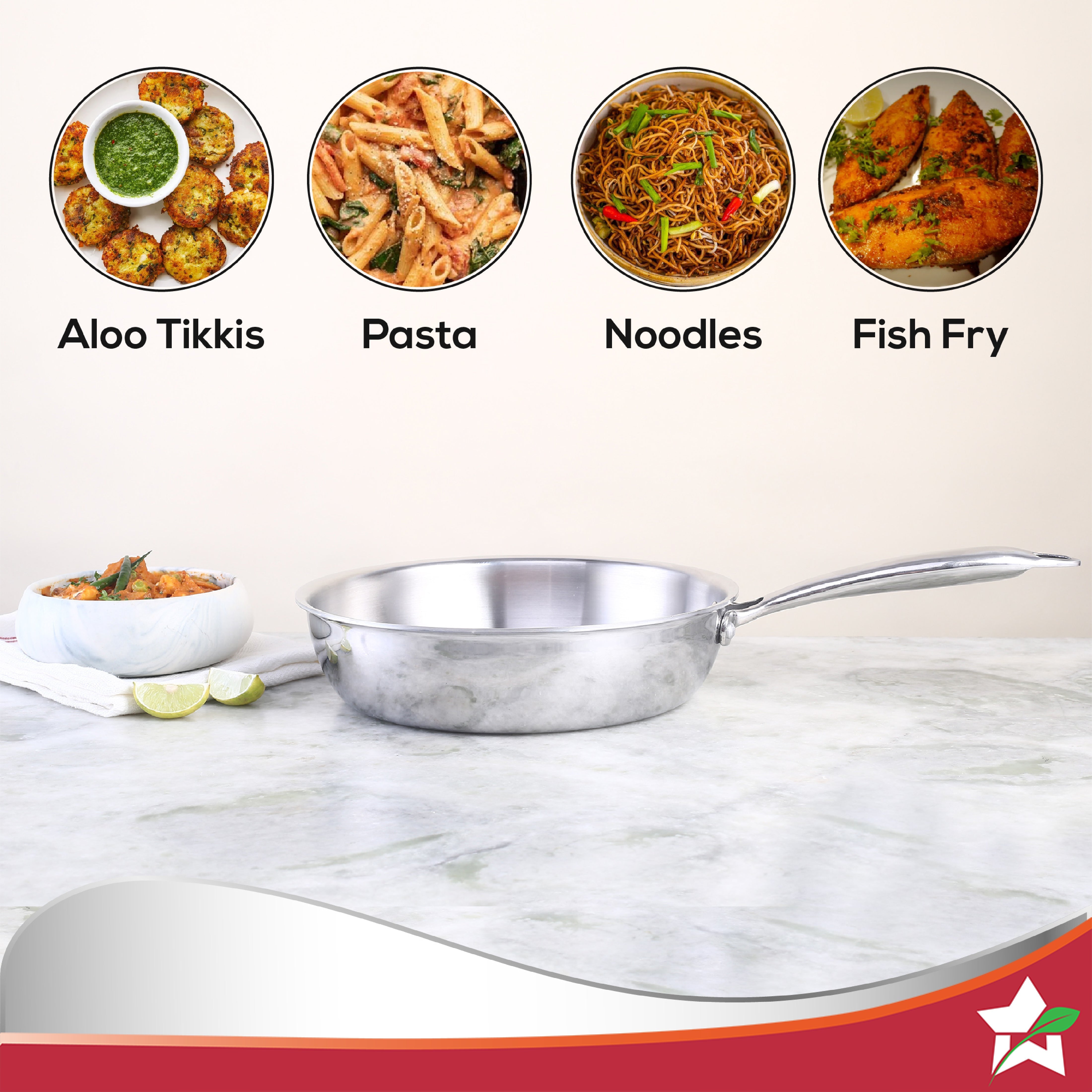 Perfect Cooking Every Time: With its 2.5mm thickness and tri-ply walls, this fry pan ensures your food is cooked to perfection without burning, while the even heat distribution guarantees consistent results every time.