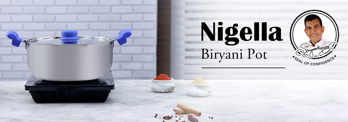 - Nigella Biryani Pot is made of food-grade stainless steel with a thick bottom for good heat retention, and the mirror finish makes it adorable.