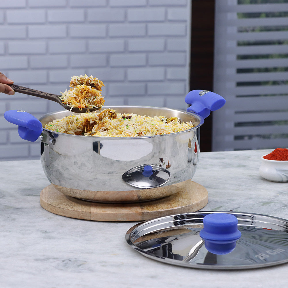 Biryani Pot has cool-touch silicone handles for an easy and comfortable grip while holding the pot, ensuring complete safety.