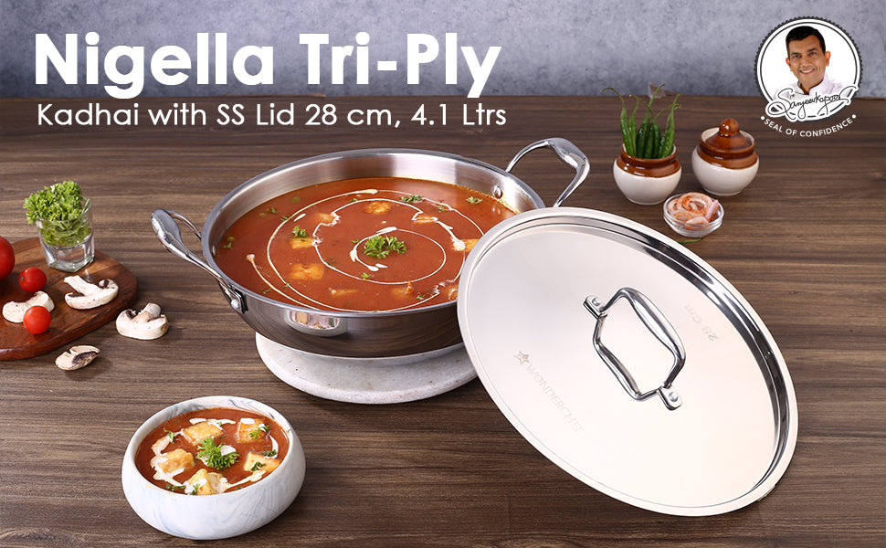 Nigella Stainless Steel Tri-Ply kadhai is made of superior quality steel. Use the kadhai to make curries, pasta, noodles and more. Nigella range is best suited for everyday cooking. And adorned by home chefs since they are very long-lasting.