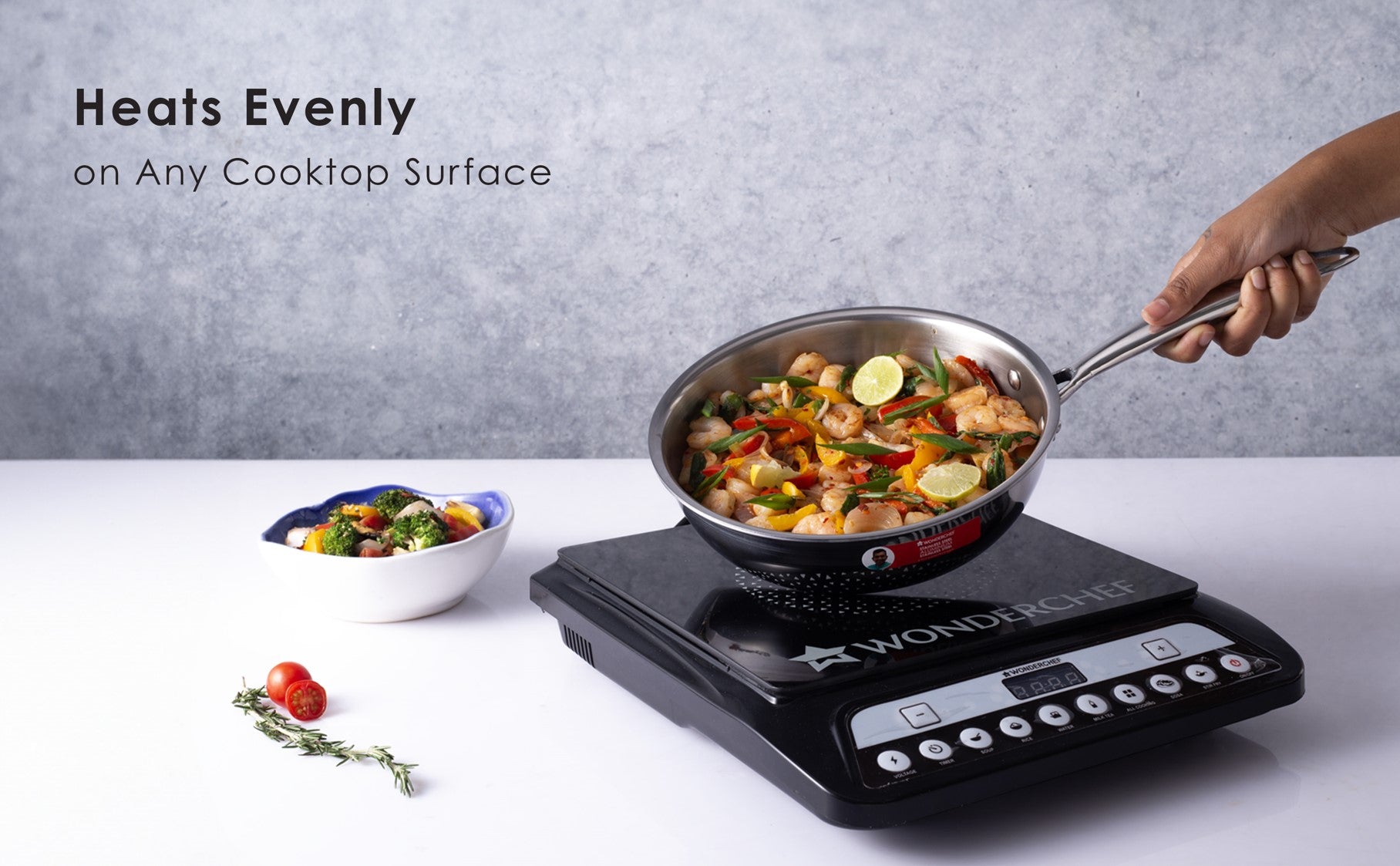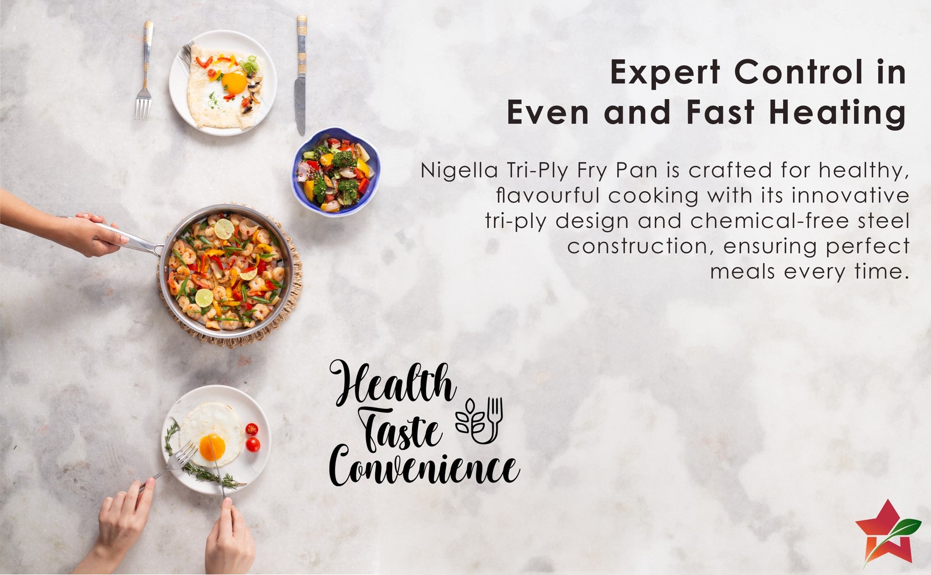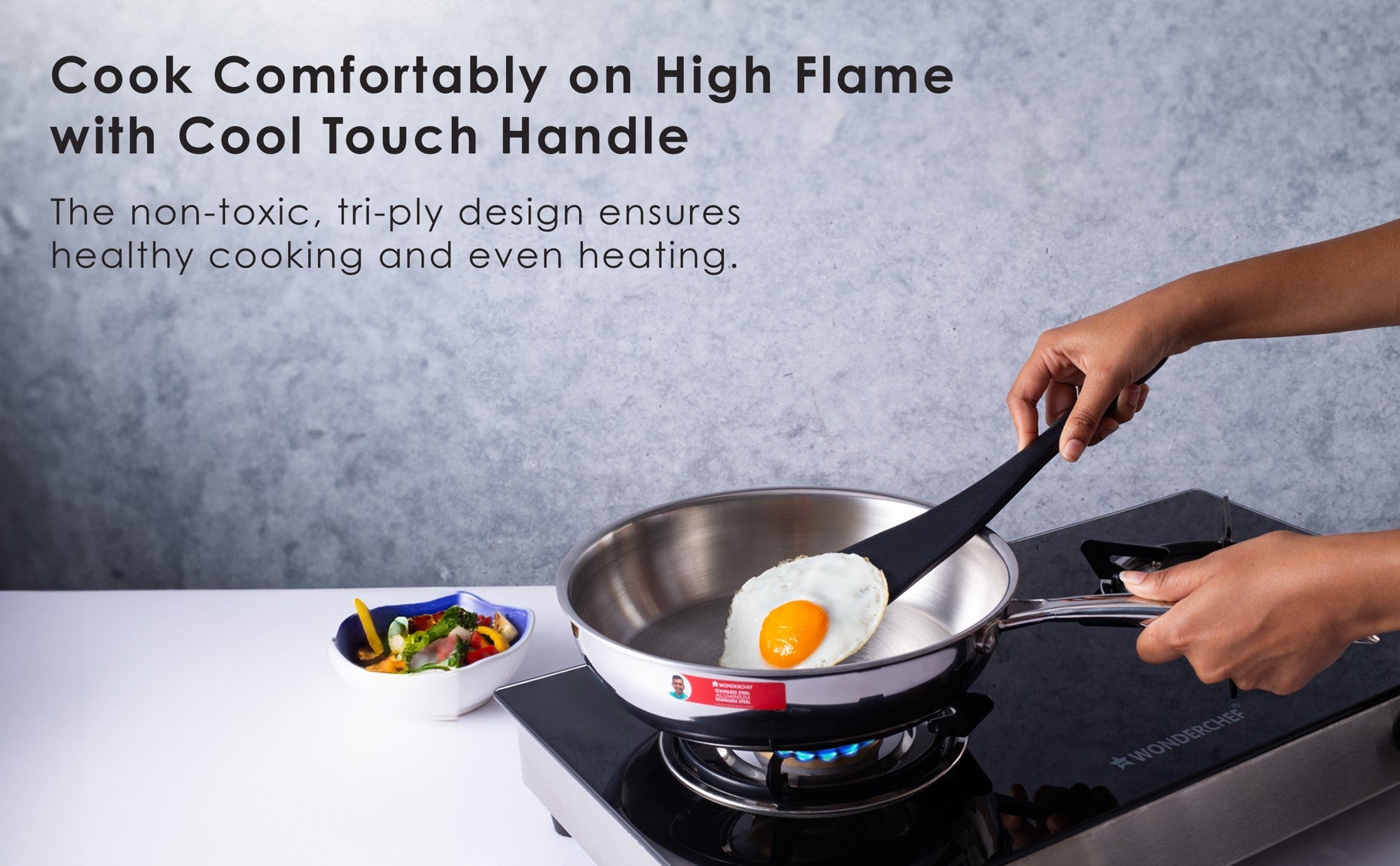 Enhanced Multi-layered Construction: The Wonderchef Nigella Tri-Ply Pan’s aluminium core is sandwiched between two non-toxic, high-grade steel layers, providing exceptional heat conduction and unmatched durability for daily use.