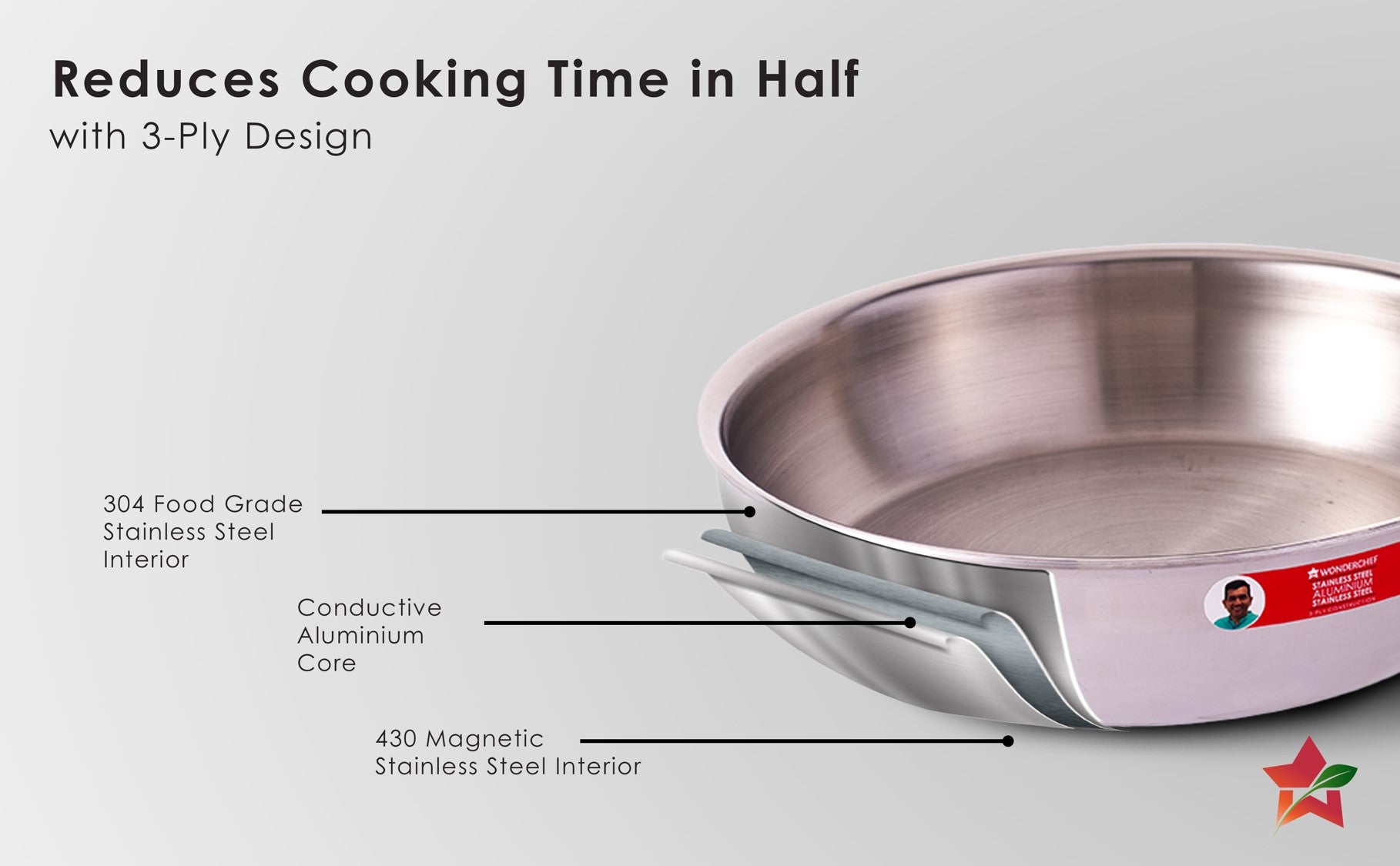 Enhanced Multi-layered Construction: The Wonderchef Nigella Tri-Ply Pan’s aluminium core is sandwiched between two non-toxic, high-grade steel layers, providing exceptional heat conduction and unmatched durability for daily use.