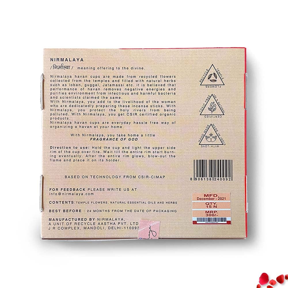 - ✅ WHY BUY NIRMALAYA? Every ingredient used in every Nirmalaya product is naturally sourced and made from recycled flowers. Nirmalaya supports women’s empowerment by providing them a livelihood and cares for the environment by recycling and crafting waste into fragrant products leaving no carbon footprint on the planet. These havan cups organic are crafted with recycled flowers and are biodegradable and safe to use.