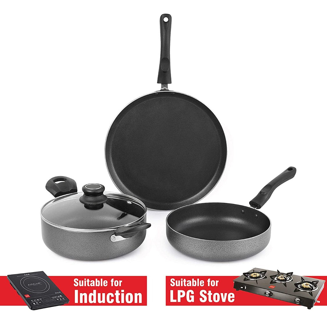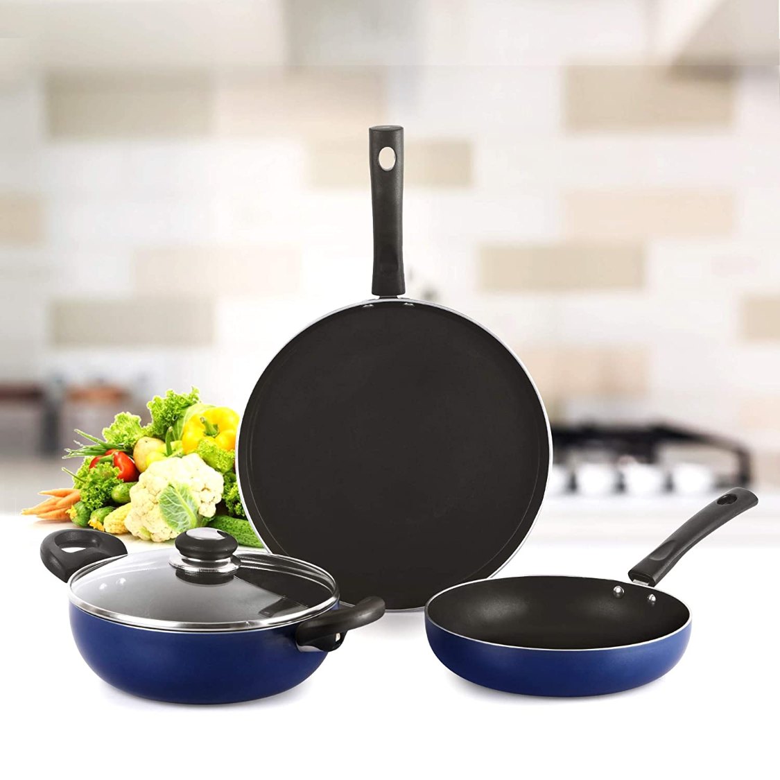 - The set includes a 1 N Kadhai with Glass Lid, 1 N Frying Pan, and 1 N Dosa Tawa.Crafted from high-quality aluminum for even heat distribution, reducing cooking time.Vibrant color options (Blue, Brown, Grey, and Cherry) let you match your cookware to your kitchen style.