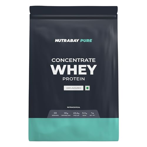 NUTRABAY Pure 100% Raw Whey Protein Concentrate, 23.4g Protein – 1Kg, Unflavoured