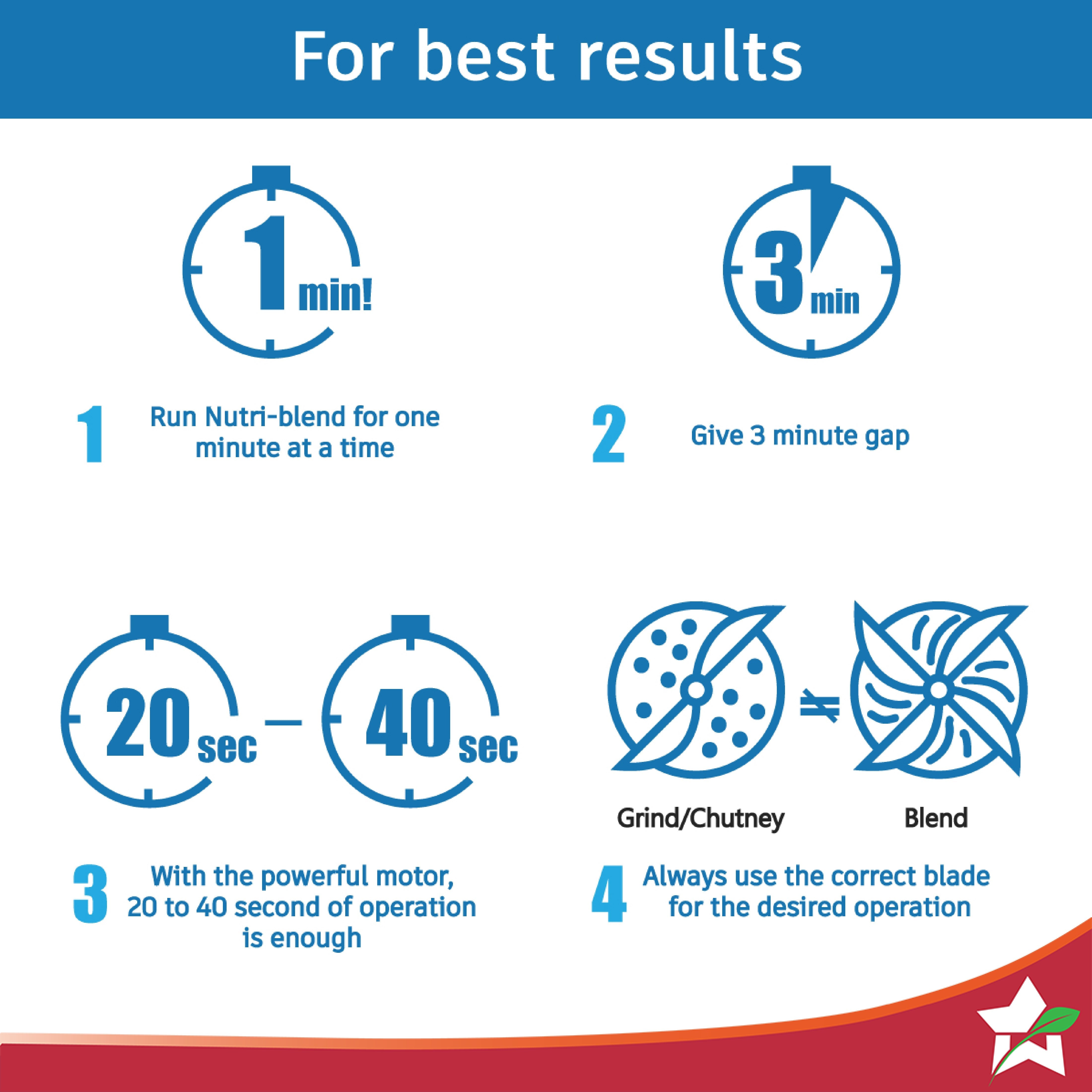 - For most foods and masalas 30 sec is enough. Do not run the appliance beyond 60 sec at one go. Give it a break of 2-3 minutes to cool down the high-speed motor and begin again