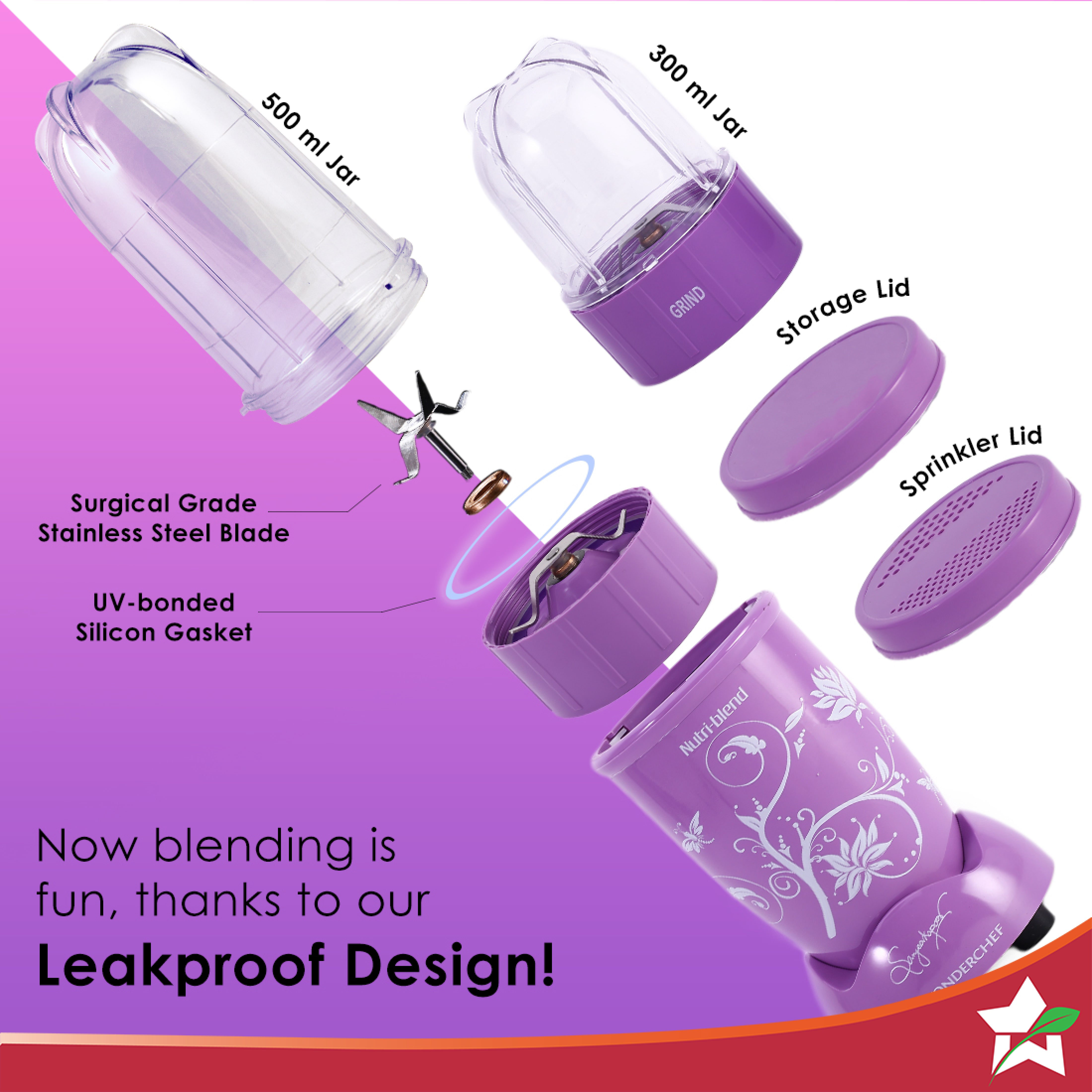- Specialised Functions: The long jar (500ml) comes with 4-wing blade for mixing blending and the short jar (300ml) with 2-wing flat blade for grinding to make all kinds of chutneys, shakes, smoothies and masalas. The product also comes with 3 useful lids – for sprinkling, storing and sipping your healthy beverage on the go.