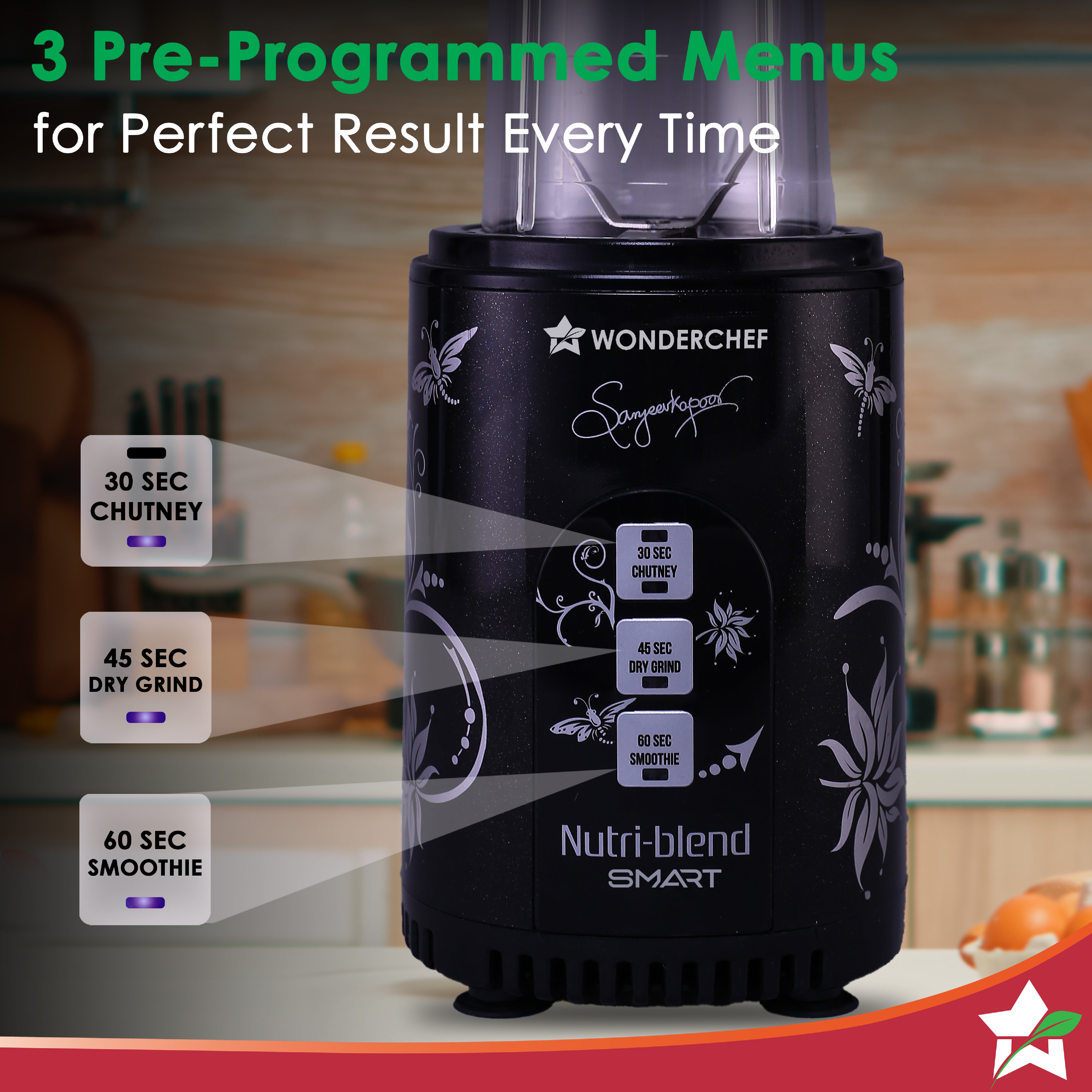- 3 Pre-programmed Menus: Nutri-blend SMARTâ„¢ is pre-programmed for dry grinding, chutney, and smoothies. Its advanced microcontroller runs the mixer for the selected time and stops it automatically so you are set free while Nutri-blend SMARTâ„¢ does its job.