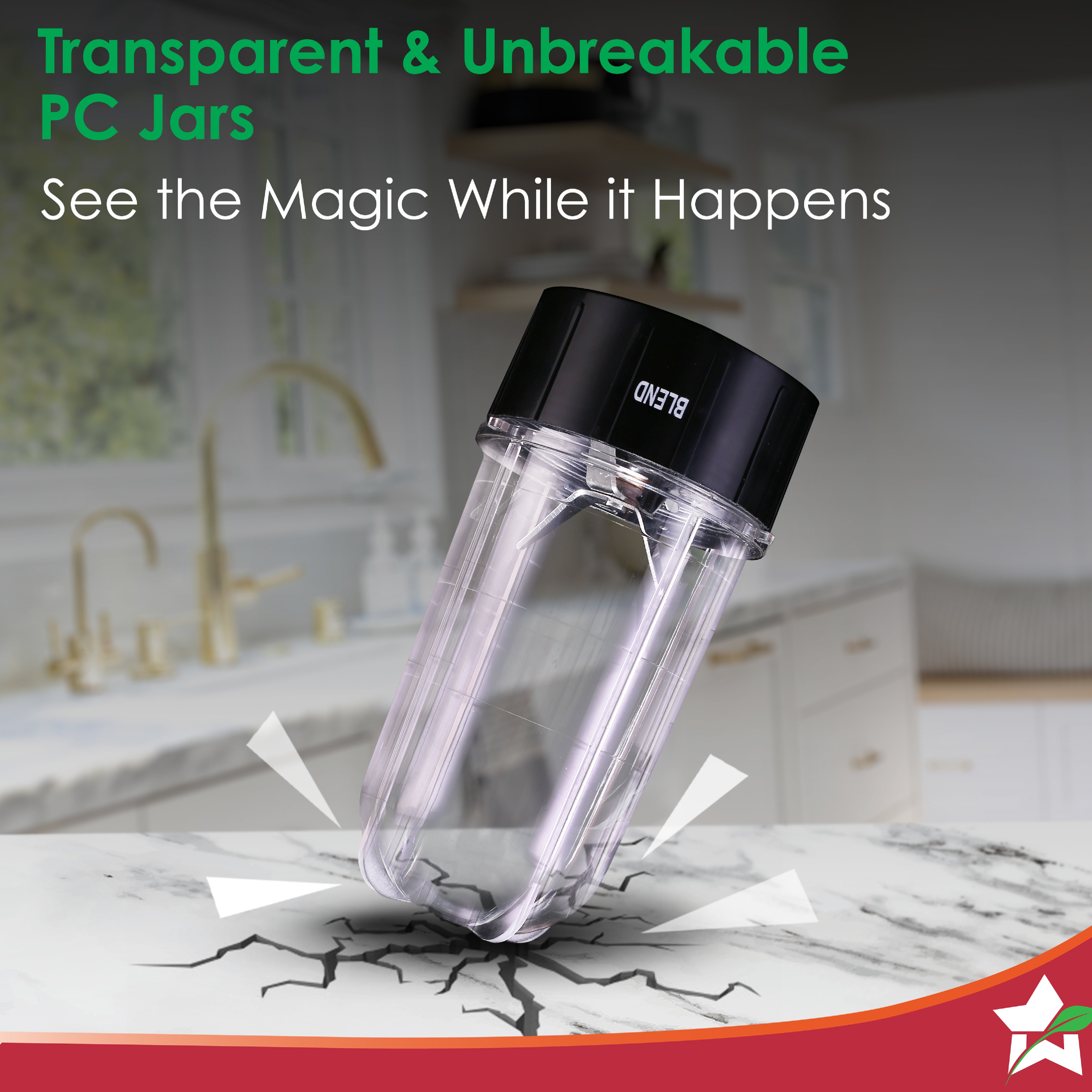 - Transparent & Unbreakable PC Jars: Monitor the progress without opening the jars. Use the tall jar (500ml) with the 4-wing blade for mixing-blending and the short jar (300ml) with the 2-wing flat blade for grinding and chutneys.