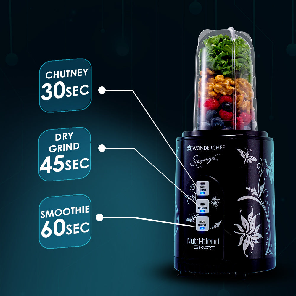 - 3 Pre-programmed Menus: Nutri-blend SMARTâ„¢ is pre-programmed for dry grinding, chutney, and smoothies. Its advanced microcontroller runs the mixer for the selected time and stops it automatically so you are set free while Nutri-blend SMARTâ„¢ does its job.