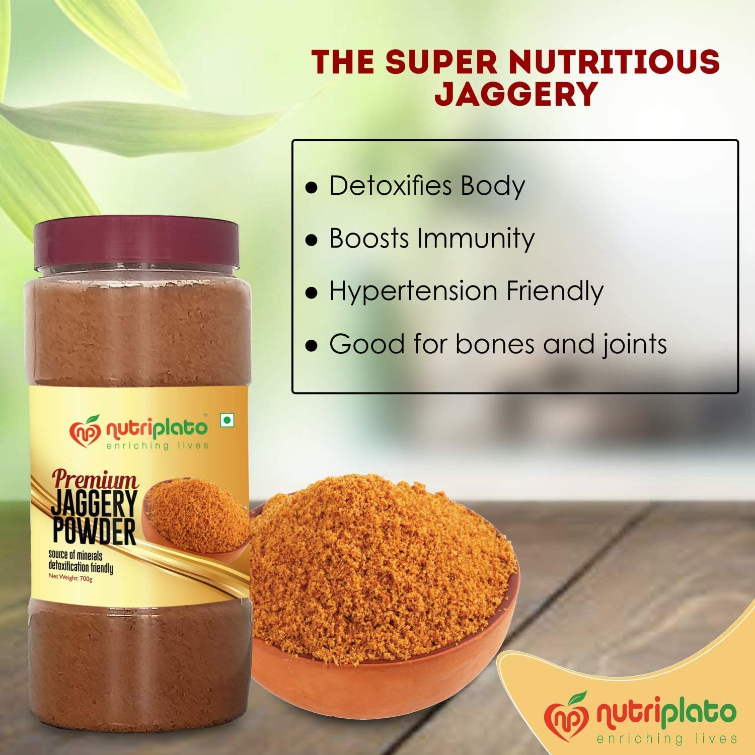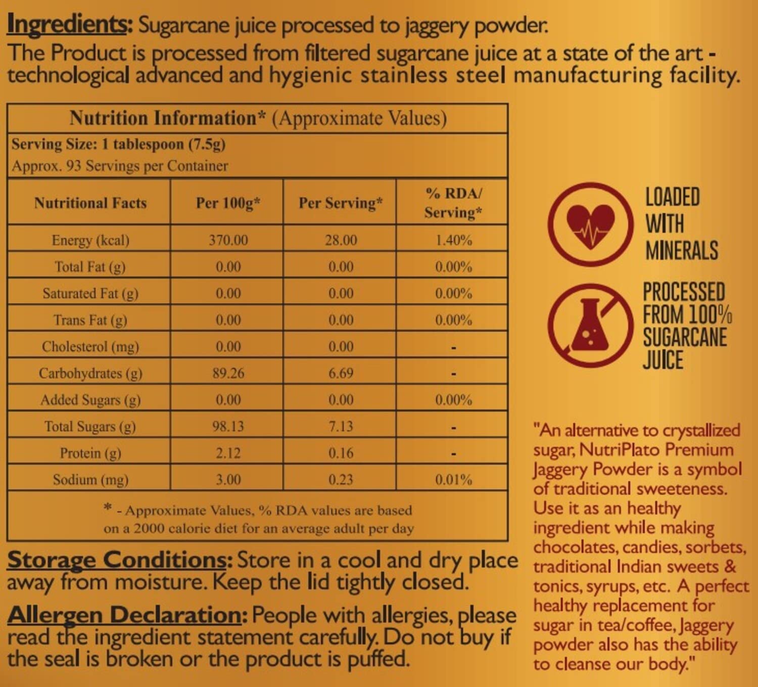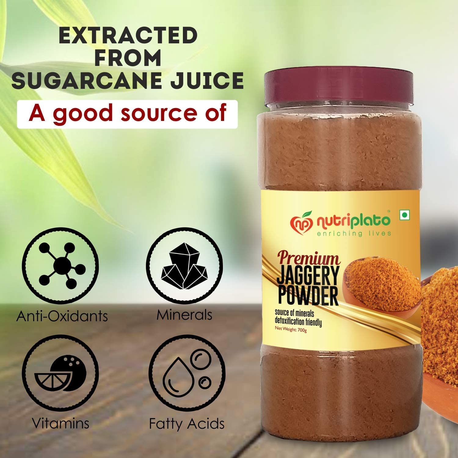 Details: Nutriplato Premium Jaggery Powder is processed without the use of any chemicals with centuries-old proven manufacturing technique. It is prepared under the guidance of the Indian Institute of Sugarcane Research. Processed from pure Sugarcane Juice of a premium quality of Sugarcane. Enjow your health with Nutriplato product range.