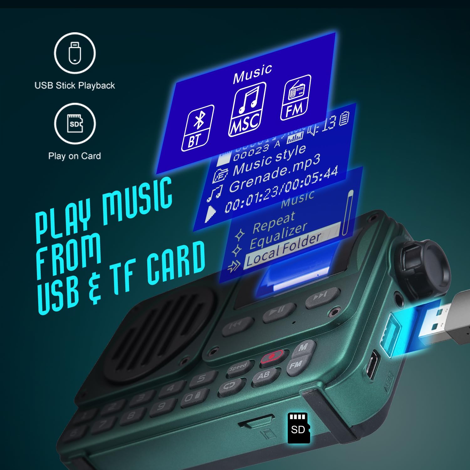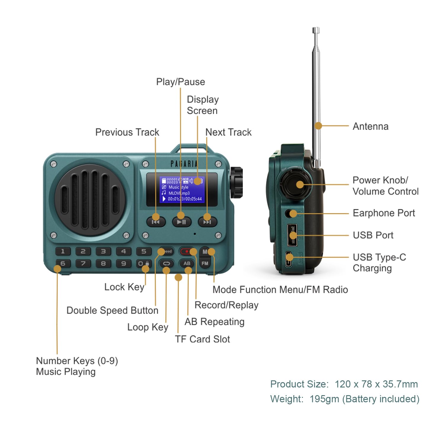 - ✅ Revolutionary Features: like SLEEP, A-B, SPEED, Voice Recording, Erase unwanted FM Stations, Choose brightness, PC Connect to transfer songs, Type C charging, 8 Hours of Non-Stop playback backup