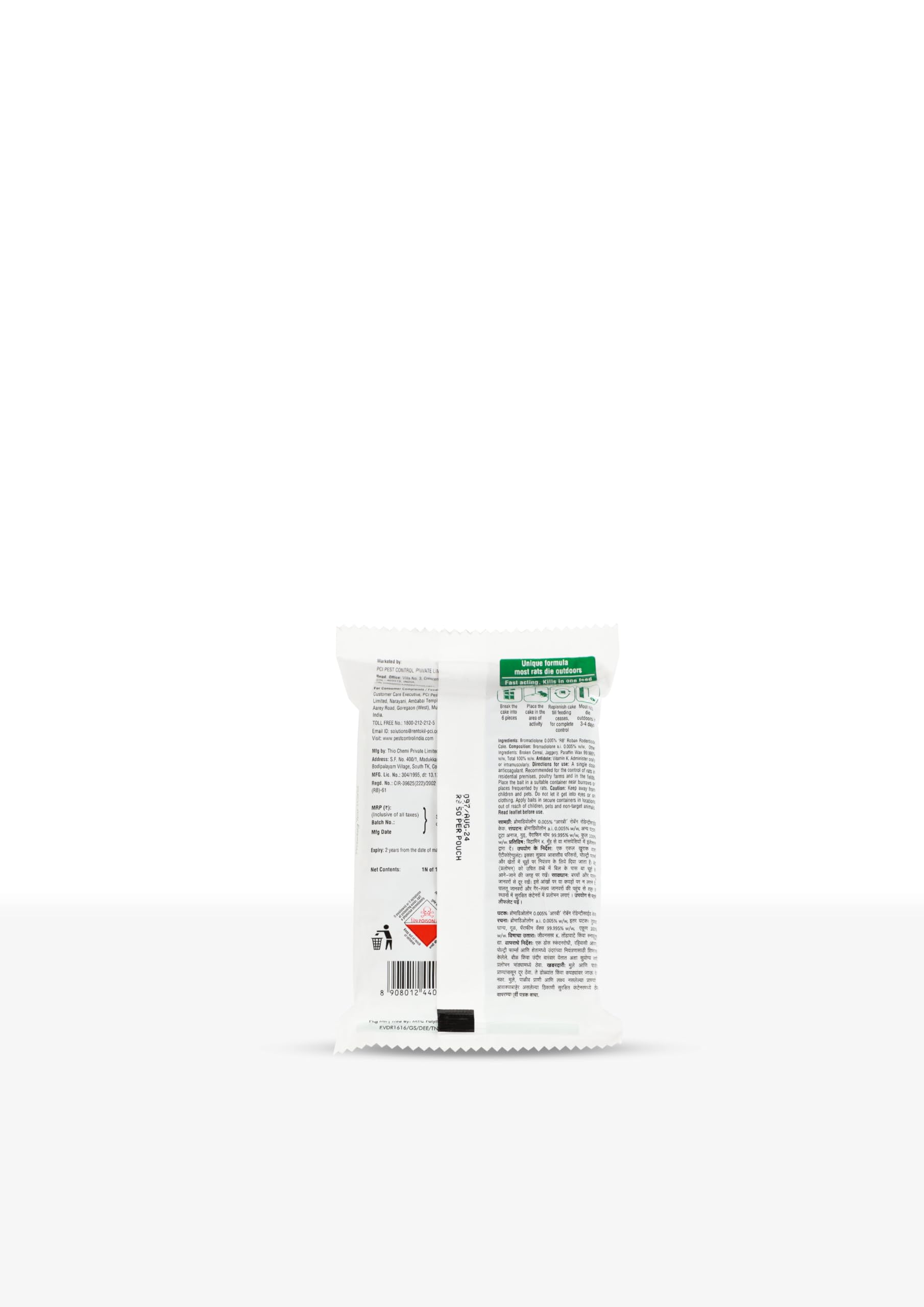 Details: Introducing our powerful rat control solution Roban Rat Cake, formulated with 0.005% Bromadiolone, a potent anticoagulant that swiftly disrupts rats’ blood clotting mechanisms. Designed for single-dose lethality, it ensures effective elimination with just one application. It minimises indoor cleanup as rats typically succumb in open spaces. Weather-resistant, it withstands diverse conditions, guaranteeing prolonged effectiveness. Conveniently shaped into easy-to-use wax blocks, it’s ready for immediate placement and hassle-free application, making it the optimal choice for efficient rat management. Experience reliable and efficient rodent control with ROBAN Rat Cake