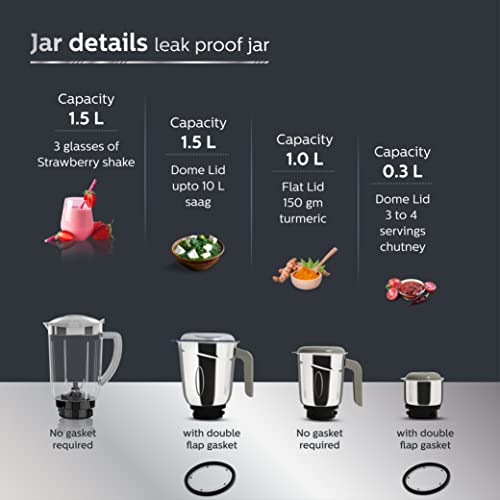 - JARS & CAPACITY: 4; Jar Size: Blender Jar(1.5L), Wet Jar (1.5 Litres), Multipurpose Jar (1 Litre), Chutney Jar (0.3 Litres); Leakproof, food-grade stainless steel jars with a semi-transparent lid that allows you to see the ingredients for perfect consistency