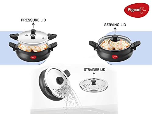 Details: All-in-One cooker, The Pigeon Belita super cooker set is a uniquely designed and highly functional version of an Indian handi, which can be used for cooking as well as serving. This set consists of a Pigeon 3 litre super cooker pot, a strainer lid, a pressure cooking lid and a serving lid. Its transparent serving lid is made of toughened glass with stainless steel rim, which preserves the aroma and heat in the dish, while the strainer lid is made from food grade stainless steel and can be used to drain hot water after cooking. The stainless steel lid of this pressure cooker ensures great sturdiness, easy maintenance and quick cooking. Stylish and Highly Durable With the Pigeon all in one super cooker, you can serve in style and with sureness as the lids and the pot have been manufactured using high-quality materials, which are reliable enough to be used every day. This Pigeon black super cooker pot has been manufactured using virgin aluminum and has been given a scratch-resistant ceramic coating. Furthermore, the cooker is induction cook top compatible! The compact Bakelite handles on either sides of the pot are short but ensure easy maneuverability. Additionally, the hard anodized aluminum make of the pot lends it a flawless black finish and helps keep the pot looking new even after years of use. Brand: Pigeon Material: Hard anodized aluminum pot, serving lid made of toughened glass lip with stainless steel rim, and the strainer made of stainless steel Package Contents: One piece bowl (3 litres), one piece strainer lid, one piece pressure cooking lid and one piece serving lid Quantity: 3 litres Ideal for cooking and serving.