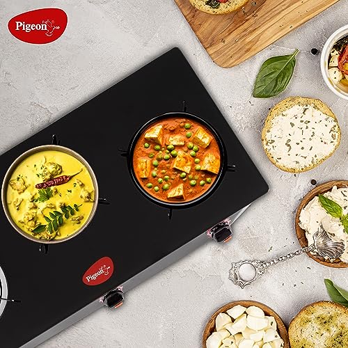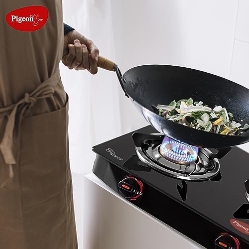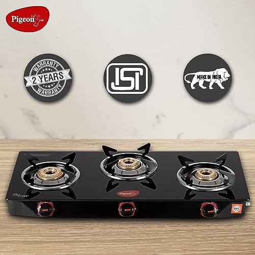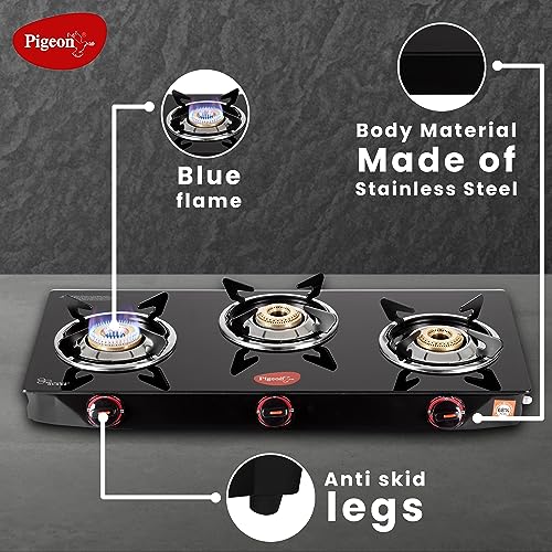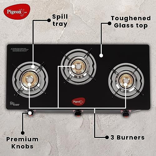 Details: The Pigeon Aster gas stove 3 burner will meet your daily cooking requirements efficiently. The stainless steel body is sturdy and durable for everyday use. Featuring three durable brass burners, cooking is no longer a chore with the Pigeon Aster gas Stove 3 Burner. Apart from being elegant and stylish, glass tops are also easy to clean. This model features unique Easy Operating knobs which are ergonomically designed to make the functioning smooth and user friendly. This spill-proof design is easy to clean and maintain. Its tubular legs ensure a firm grip over the platform, preventing it from skidding when heavier cookware is used.