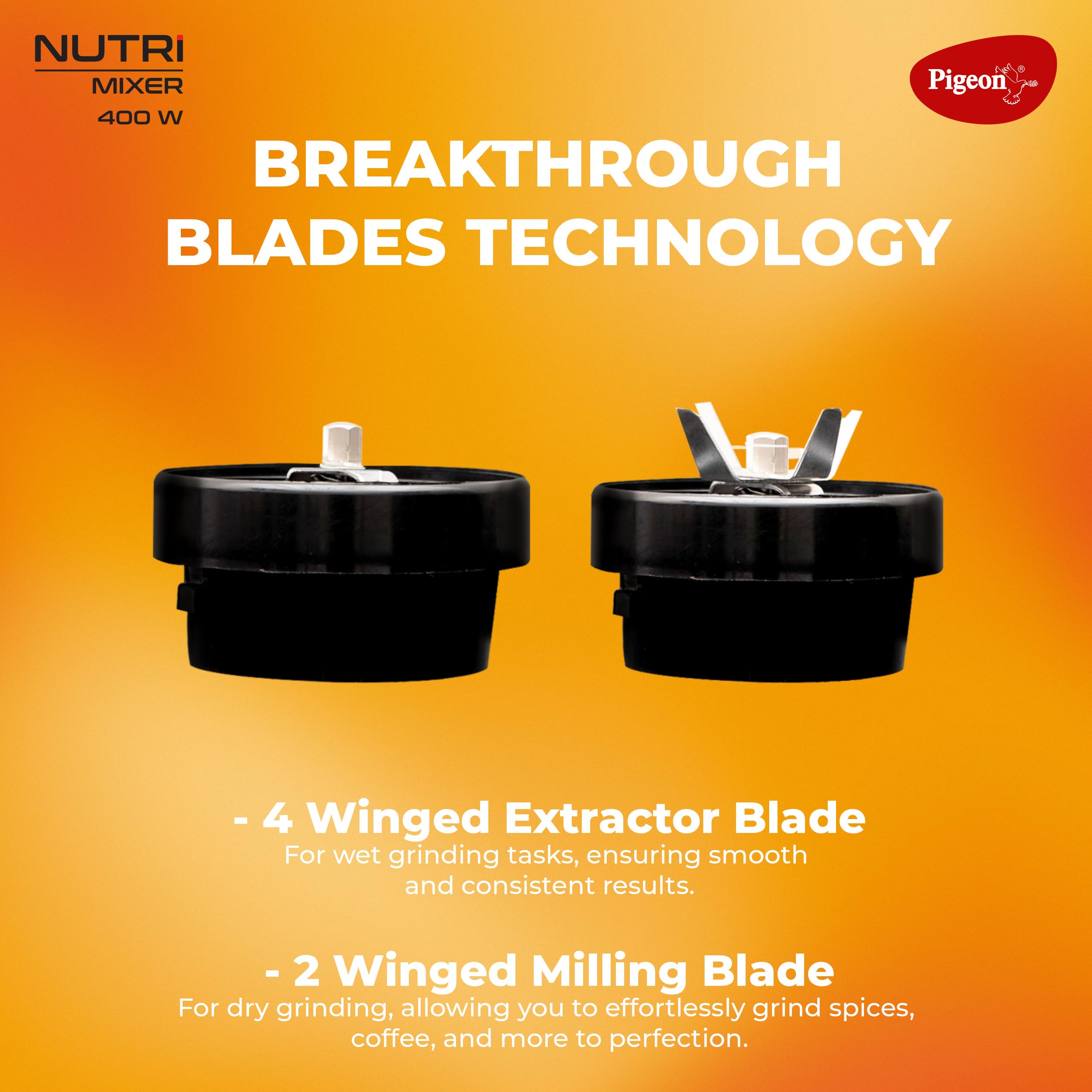 - Pigeon Nutri Mixer, Mixing,Juicing, Blending & Grinding System | Powerful 400W 18000 RPM motor | Stainless steel Blades | 3 unbreakable jars | 2 Storage Lids | 1 Strainer Lid | 2 Socket | 1 Sipper | 1 Years warranty | Black