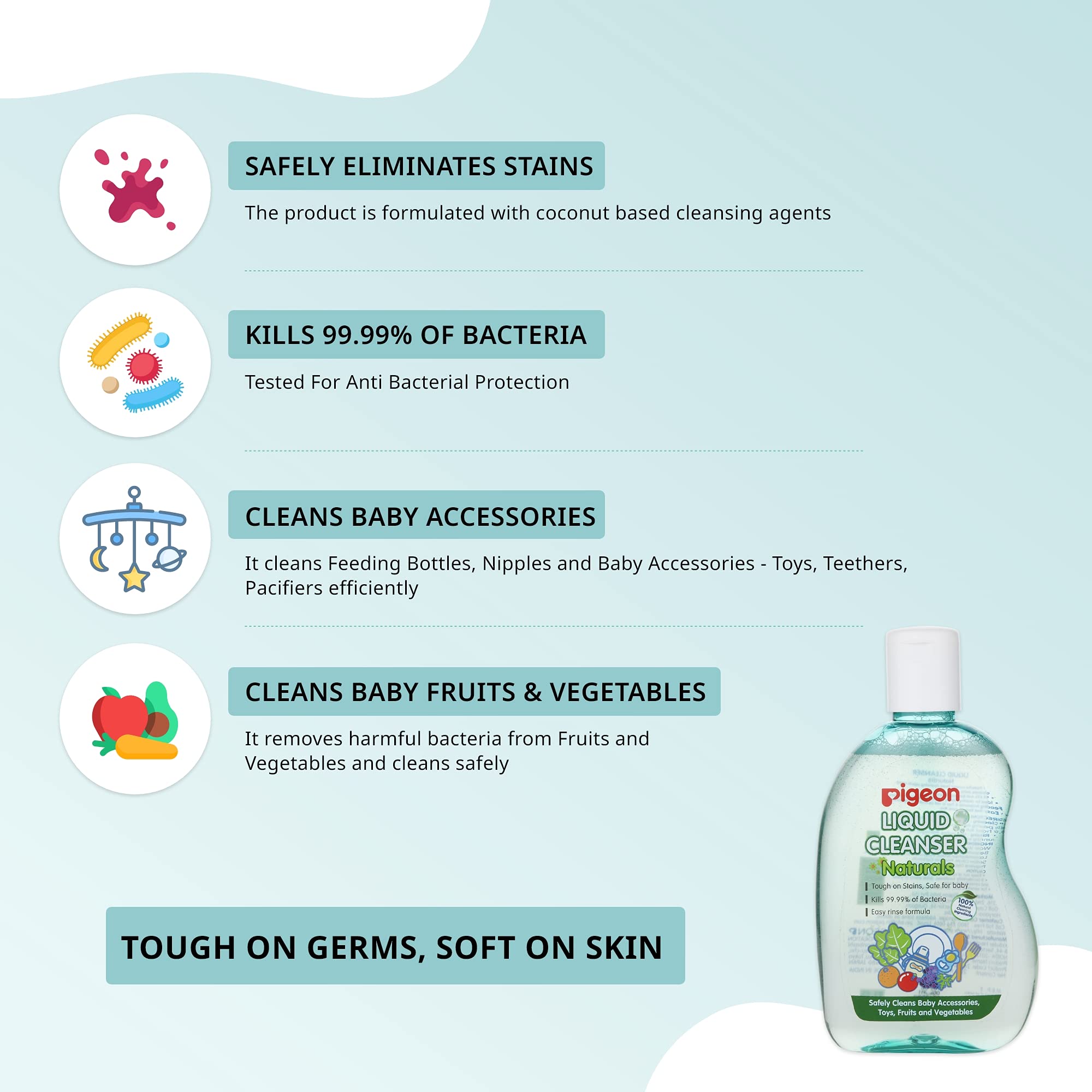 - Pigeon Liquid Cleanser is ideal for cleaning feeding bottles, Nipple/Teats, Pacifiers, Feeding Accessories & Toys as well as fruit and vegetables, etc