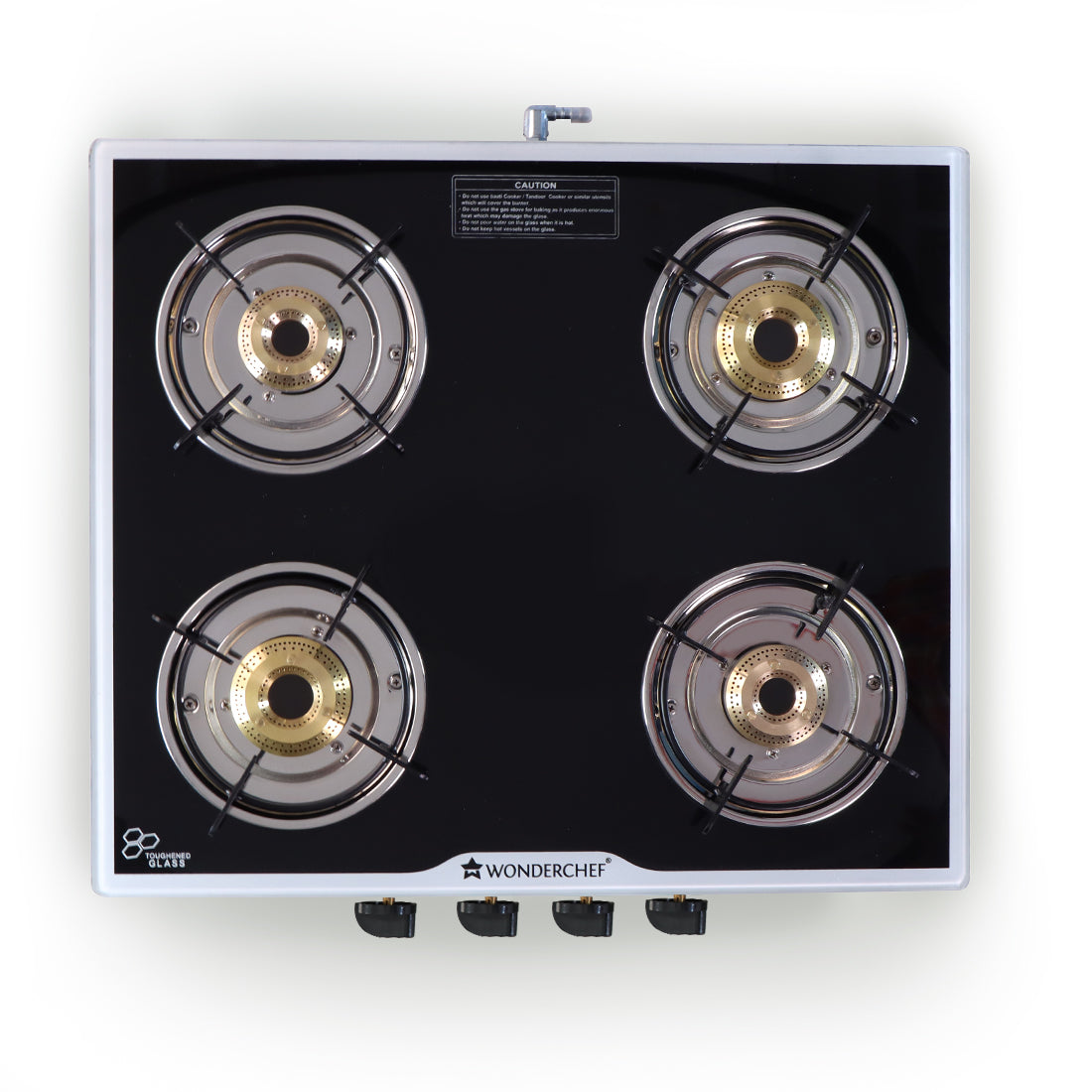 Platinum 4 Burner Glass Cooktop is a compact, spacious glass cooktop that offers a melange of performance and beauty in your kitchen. With individual pan supports, you can cook for the entire family with ease. The toughened glass top makes it convenient to clean. Stainless steel drip tray, ergonomically designed knobs, high-efficiency brass burners, powder-coated pan support, and Reliable Wonderchef Service make it a must Buy. Cooking made Practical!