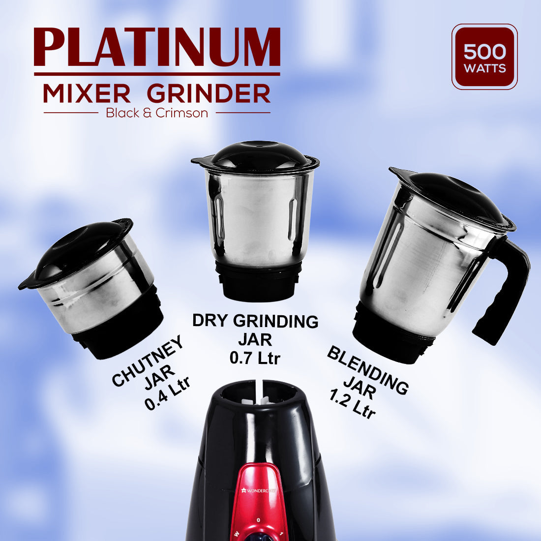 The Platinum Mixer Grinder delivers superior mixing and grinding performance. Its powerful 550W motor easily handles every ingredient, from turmeric and coconut to idli-dosa batter. The 3-speed control takes on everything from low-speed chopping to high-speed mixing or grinding, and the whip feature brings in the convenience of running the appliance at the maximum speed as per the need. Bring home stellar performance and complete joy of cooking with Wonderchef Platinum Mixer Grinder.