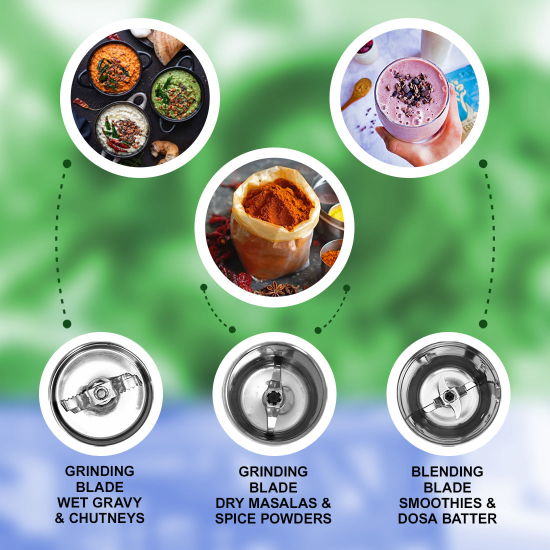 - Anti-rust stainless steel blades grind even the toughest of ingredients to make amazing podi, sambhar masala, coconut chutney, garam masala, idli-dosa batter, purée, pastes, milkshakes, smoothies and much more!